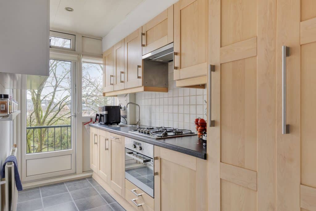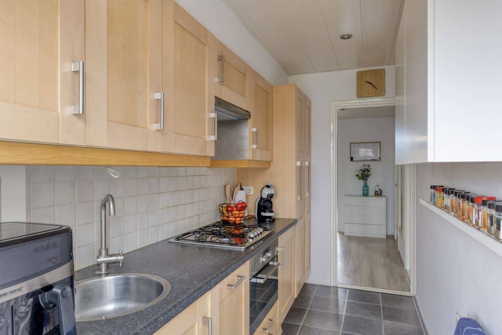 De keuken bevindt zich aan de achterzijde van het appartement, is voorzien van inbouwapparatuur en geeft toegang tot het tweede balkon. Daarnaast is er praktische kastruimte aanwezig voor voorraad en apparatuur.