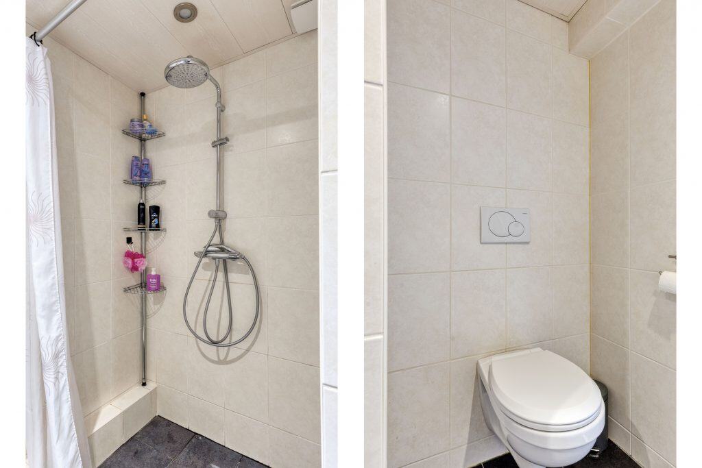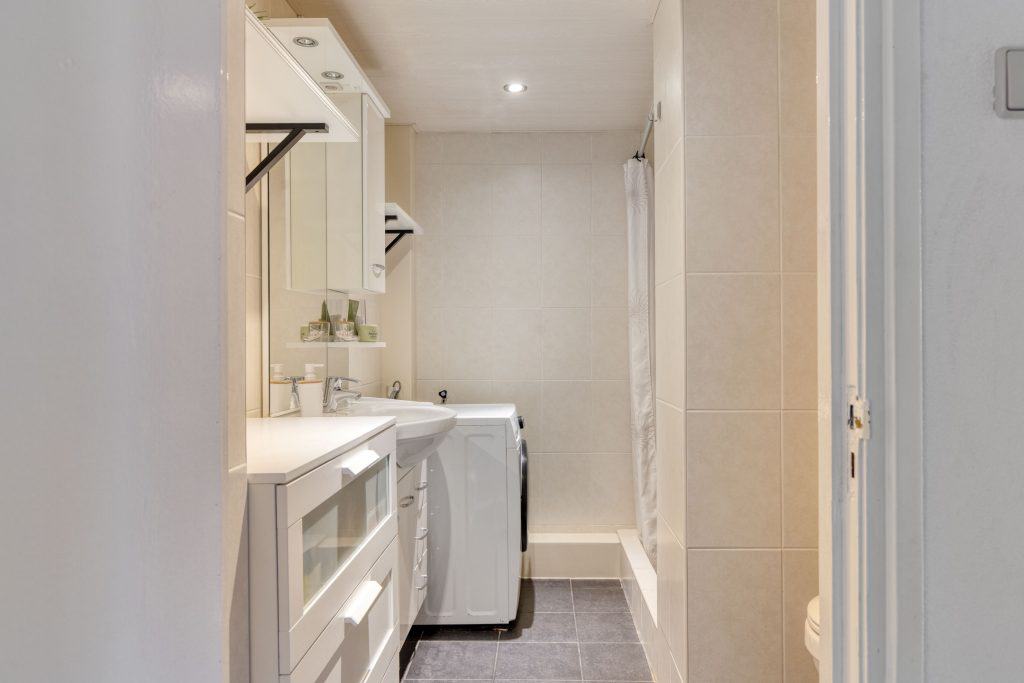 De badkamer is netjes uitgevoerd en voorzien van een douche, wastafel, toilet en aansluitingen voor de wasapparatuur.