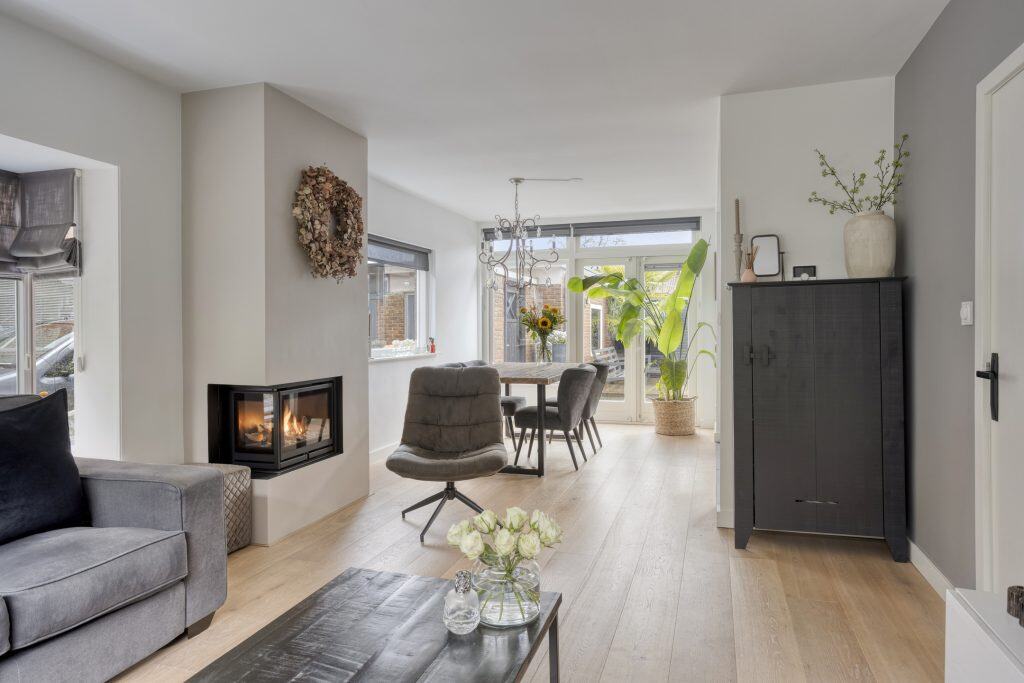 Via de voordeur kom je in een hal met het gemoderniseerde toilet, de trap naar de verdieping en de kelderkast. Vanuit de hal kom je ook in de woonkamer. Meteen al een prettige ruimte met veel lichtinval. De oppervlakte is goed en je hebt hier een mooi uitzicht over de grote voortuin en op het tegenover gelegen groen. Ook is de woonkamer voorzien van een eiken parketvloer, een zij-erker en een gaskachel. Gezellig voor ‘s avonds of als het wat kouder is. In de woonkamer heb je ruimte genoeg voor een grote zithoek en een grote eettafel en via dubbele tuindeuren kun je de tuin in.