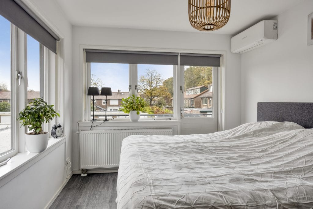 Via de trap in de hal kom je op de overloop van de eerste verdieping. Net als begane grond ziet ook deze verdieping er strak afgewerkt uit. De overloop geeft toegang tot de badkamer, een separaat en modern 2e toilet en drie slaapkamers. Alle drie de kamers zijn van een prima formaat. De ouderslaapkamer biedt toegang tot het balkon en is voorzien van airco.