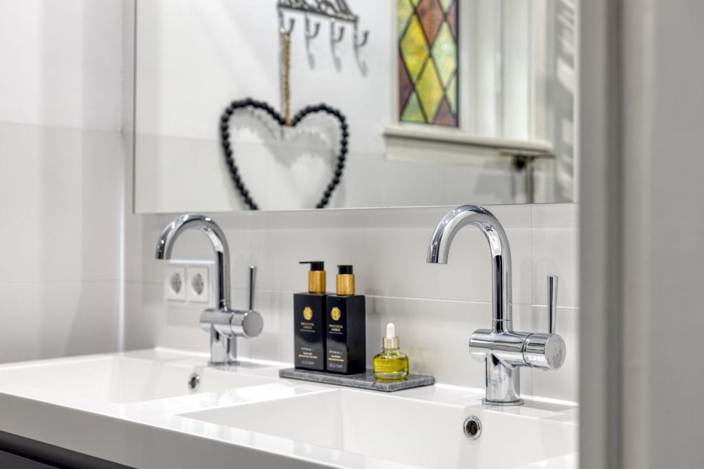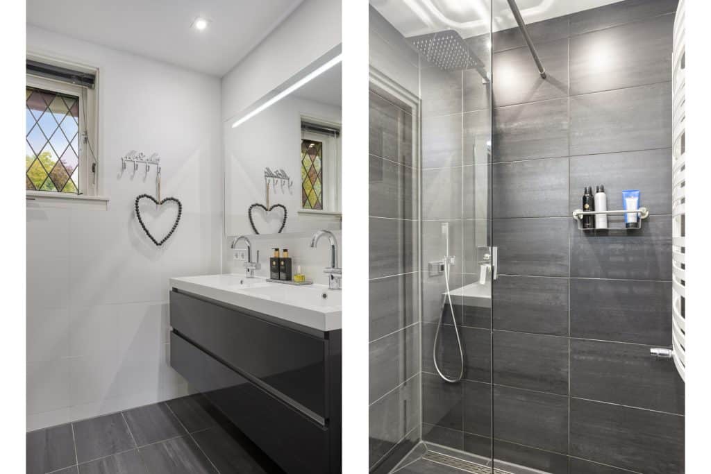 De mooie, moderne badkamer is vergroot, geheel betegeld, heeft een glas in lood raam en voorzien van een inloopdouche met een regendouche en handdouche en een dubbel wastafelmeubel.