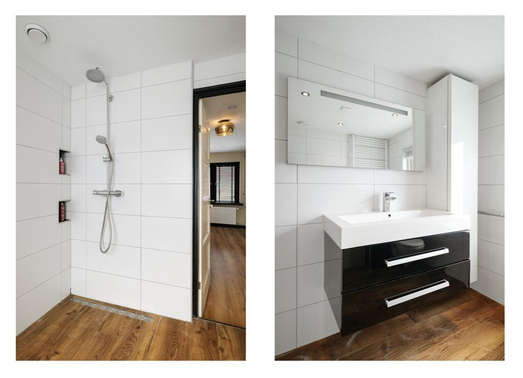Op de eerste verdieping geeft de overloop toegang tot twee ruim bemeten slaapkamers, de badkamer en de wasruimte. De badkamer is modern afgewerkt en beschikt over een inloopdouche, een wastafelmeubel en een toilet. Op de royale overloop bestaat de mogelijkheid om een extra kamer te realiseren.