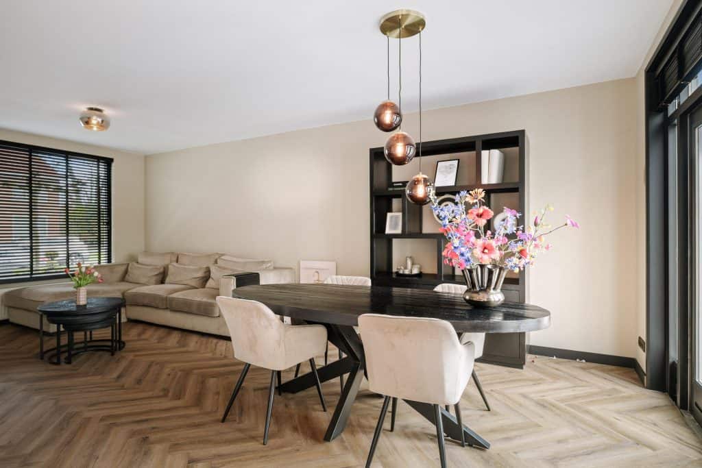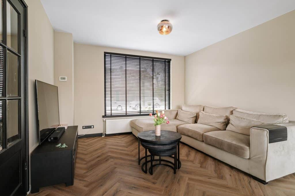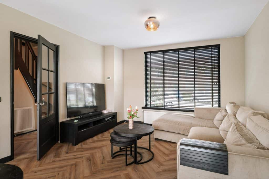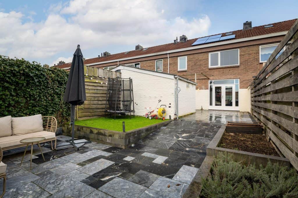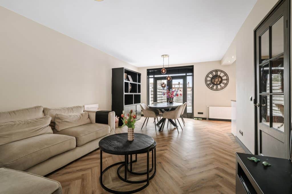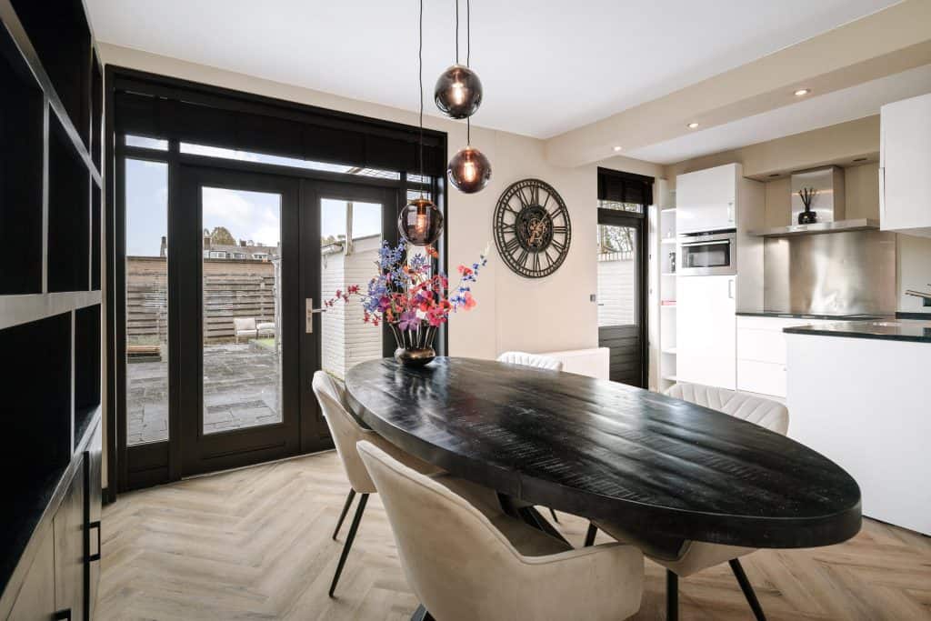 De openslaande deuren aan de achterzijde zorgen voor een fijne verbinding met de tuin en veel lichtinval.