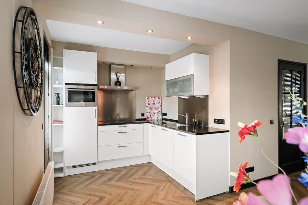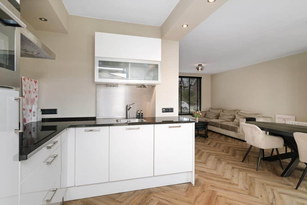 De woonkamer is opvallend licht en ruim opgezet. Door het openbreken van de muur naar de keuken is een prettige open leefruimte ontstaan. Hier is voldoende plaats voor een comfortabele zithoek en een ruime eethoek. De open keuken is modern uitgevoerd en voorzien van diverse inbouwapparatuur en voldoende kast- en werkruimte.