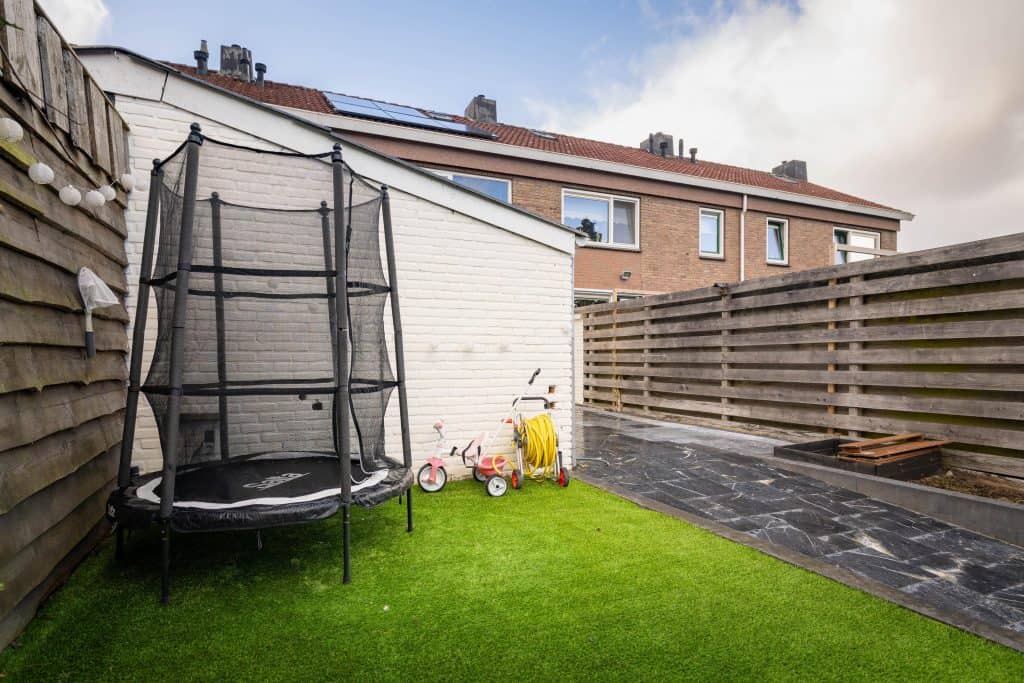 De voor- en achtertuin zijn fraai aangelegd en keurig onderhouden. De achtertuin is met een diepte van circa 15 meter lekker royaal en biedt altijd een fijne plek in de zon of schaduw te zitten. In de tuin bevindt zich een vrijstaande stenen berging, voorzien van elektra en water, en de tuin beschikt bovendien over een praktische achterom.