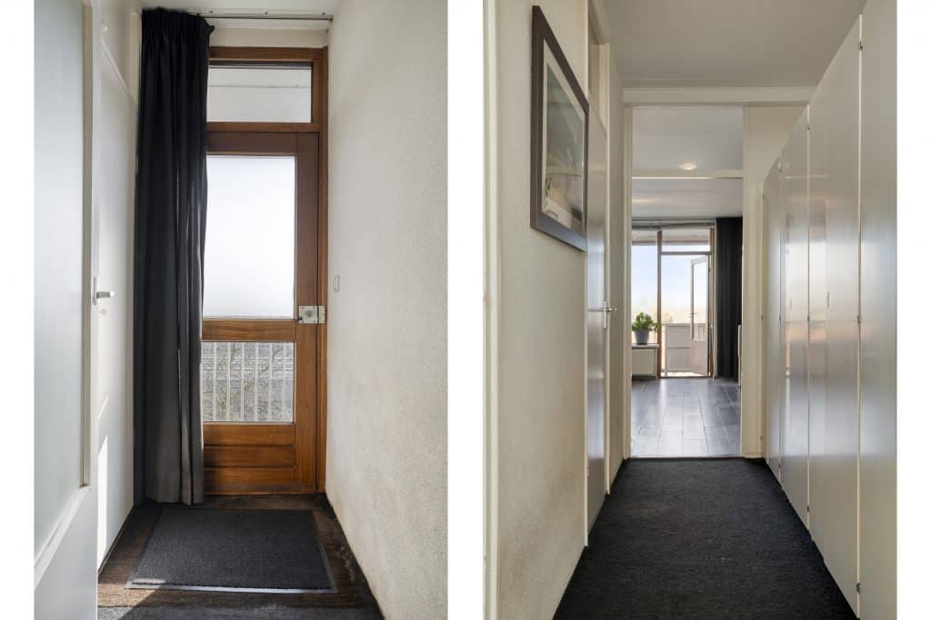 Door de woning heen: Bij binnenkomst via de ruime hal en het tochtportaal bereik je de woonkamer. Deze ruimte kenmerkt zich door de prettige lichtinval en het vrije uitzicht, wat zorgt voor een aangename woonbeleving met veel privacy. Vanuit de woonkamer is er directe toegang tot het balkon.