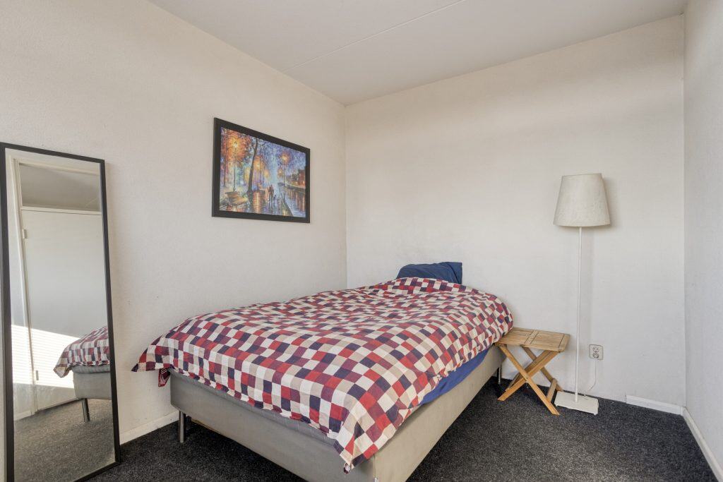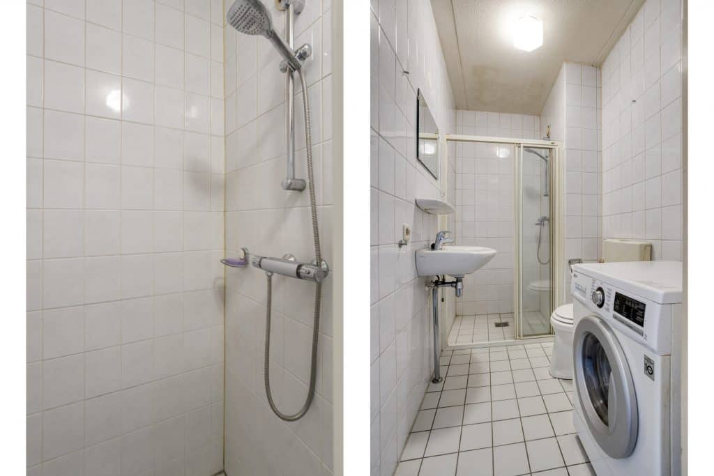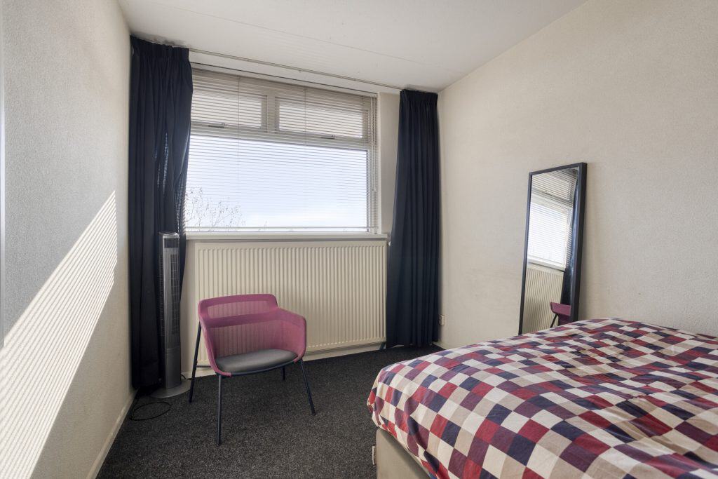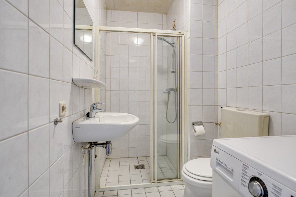 Via de hal zijn tevens de overige ruimtes bereikbaar. De badkamer is volledig betegeld in een lichte kleurstelling en voorzien van een douche, toilet, wastafel en aansluitingen voor wasapparatuur. De slaapkamer is gelegen aan de achterzijde van het appartement.