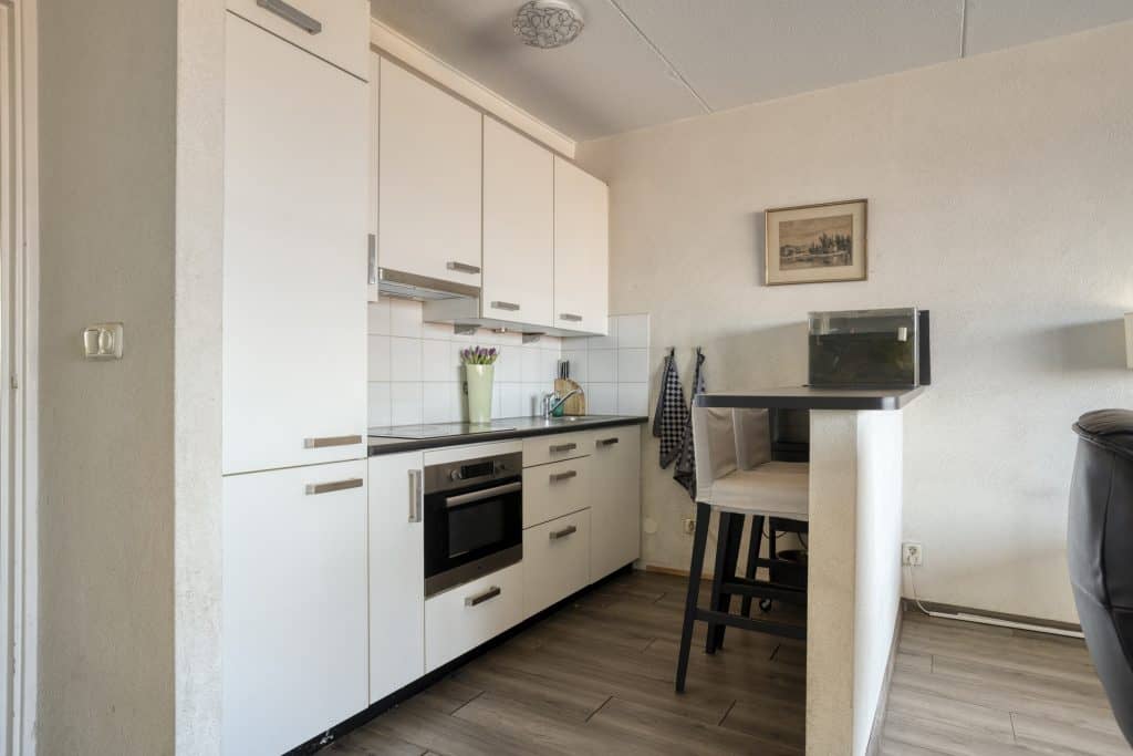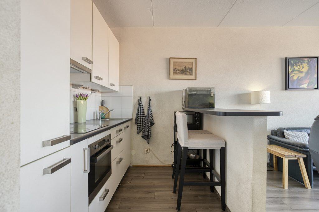 De open keuken sluit aan op de woonkamer en is uitgevoerd in een lichte kleurstelling. De keuken beschikt over inbouwapparatuur en een praktische eetbar.