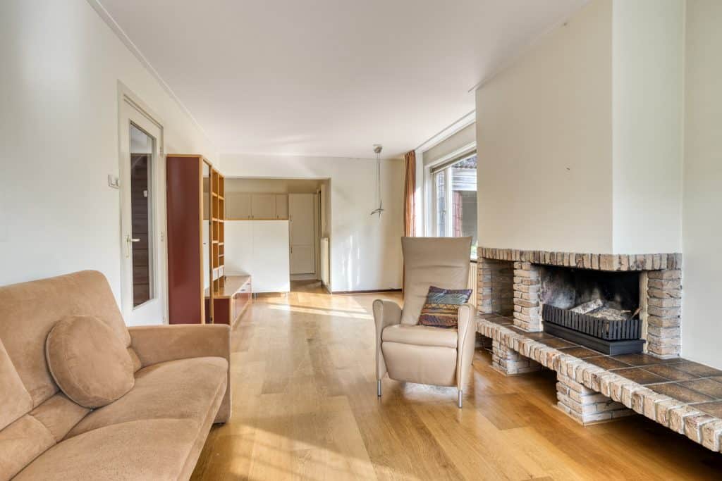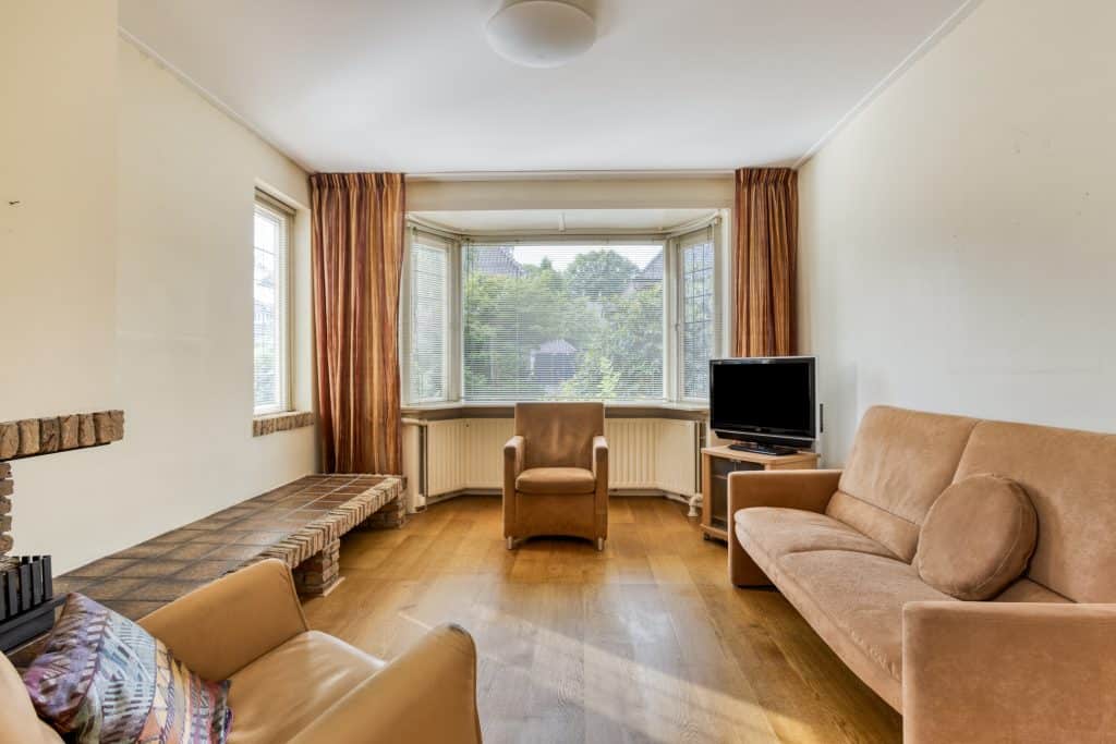 We komen binnen in de ruime hal met de trap naar de verdieping. We lopen door naar de woonkamer. De woonkamer is van een prima formaat, heeft aan de voorzijde een erker en je hebt hier veel lichtinval. Je vindt hier ruimte genoeg voor je zithoek en een grote eettafel. Ook beschikt de woonkamer over een open haard.
