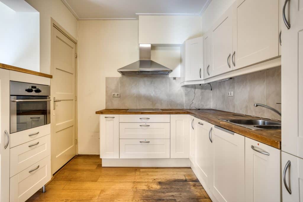 De halfopen keuken bevindt zich achter de woonkamer. De keuken is gedateerd maar de oppervlakte is goed. Vanuit de keuken is de provisiekelder bereikbaar en ook kom je via de keuken in een achterhal met het toilet en een aangebouwde tuinkamer met dubbele deuren naar de tuin. Vanuit deze kamer is een ruime inpandige berging bereikbaar.