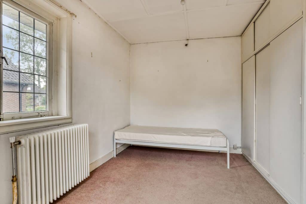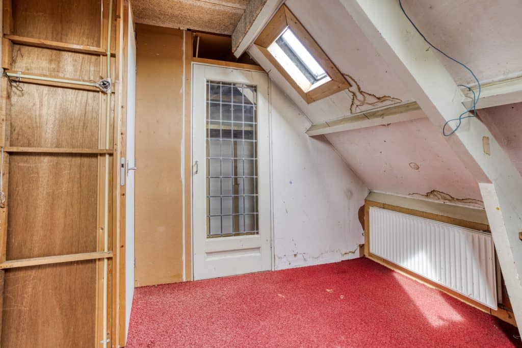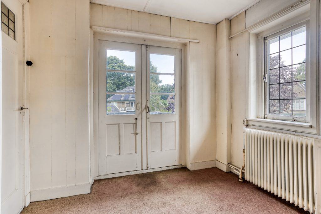 Via de vaste trap in de hal komen we op de overloop van de eerste verdieping. Hier vind je 2 slaapkamers en de badkamer. Aan de voorzijde van de woning vind je een meer dan royale slaapkamer met vaste kastruimte. Voorheen waren dit twee kamers. Mocht je hier weer twee kamers van willen maken kan dit gemakkelijk door het plaatsen van een wand, kozijn en een deur extra. De slaapkamer aan de achterzijde geeft toegang tot het balkon.