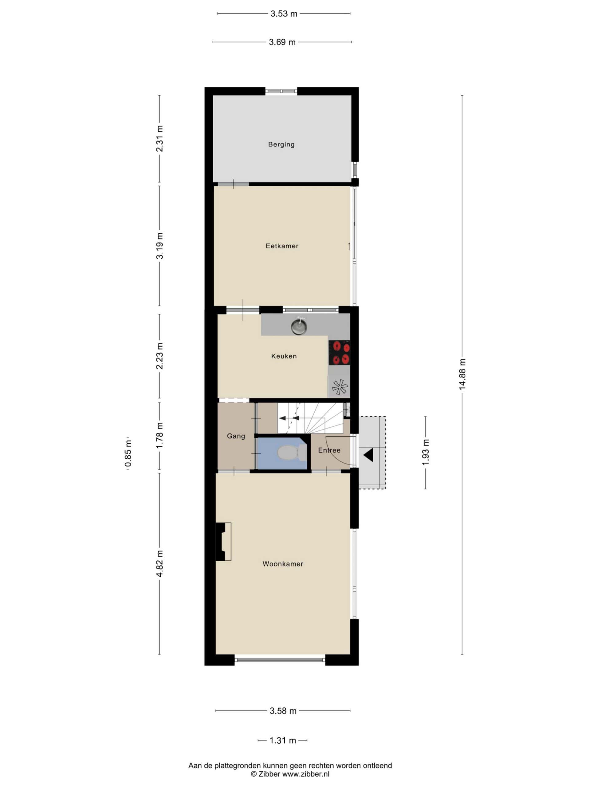 Door de woning heen: we komen binnen in de hal met de meterkast. We lopen door naar de woonkamer, een gezellige ruimte met veel lichtinval en er wordt verwarmd door een gashaard. Tussen de woonkamer en de keuken zijn het toilet en de kelderkast gesitueerd. De dichte, eiken keuken bevindt zich aan de achterzijde van de woning en is in L-vorm opgesteld. Er is ruimte voor het plaatsen van een kleine eettafel.
