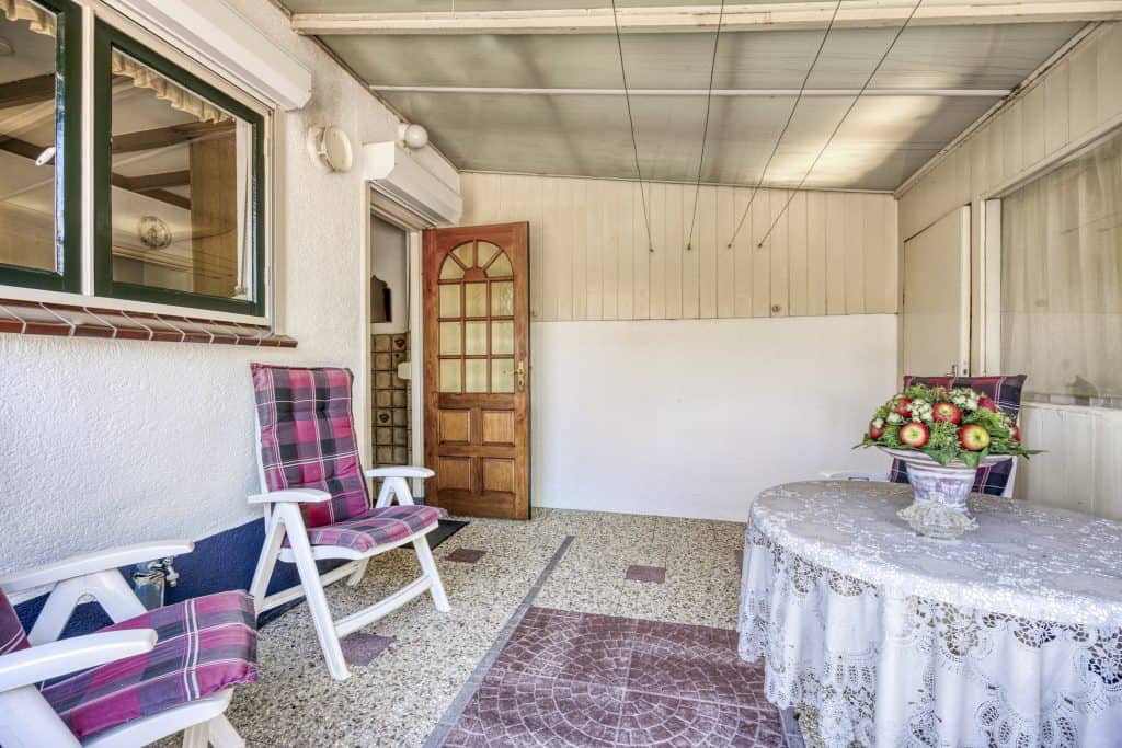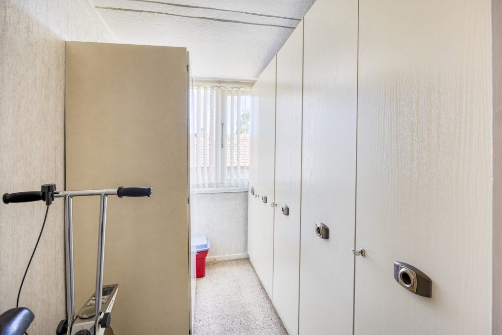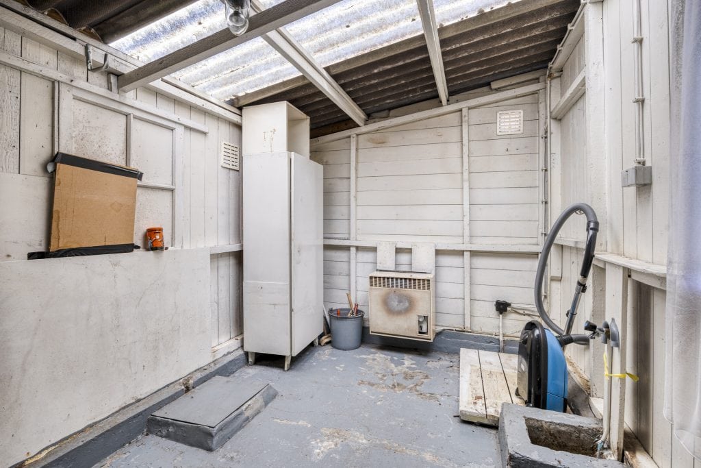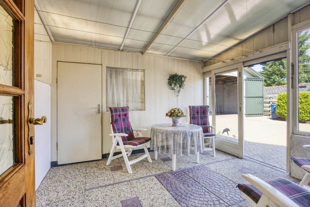 Aan de achterzijde, tussen de woning en de berging is er een overkapping/serre En in de berging is de aansluiting voor de wasmachine.