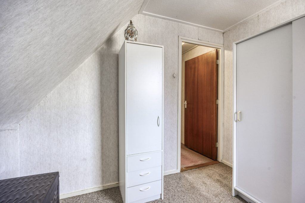 We nemen de trap naar de verdieping. Vanaf de overloop zijn er 3 slaapkamers en de badkamer bereikbaar. De badkamer is uitgevoerd met een douche en een vaste wastafel. En er is een klein luik naar de onbevloerde vliering.