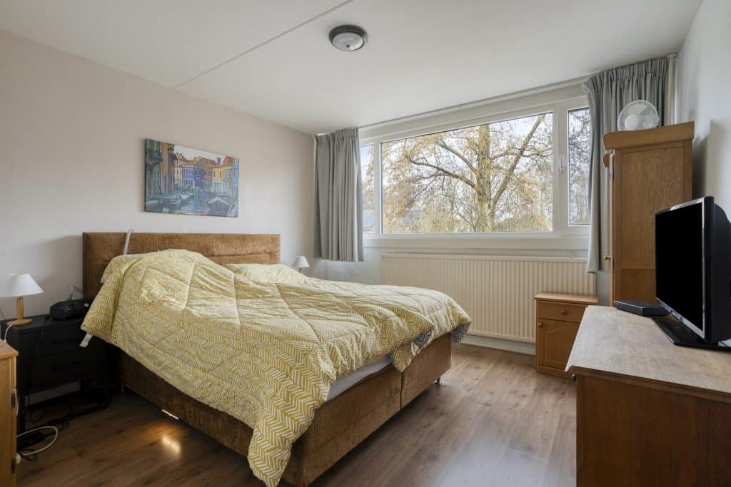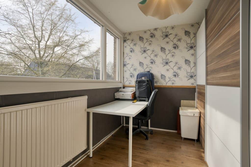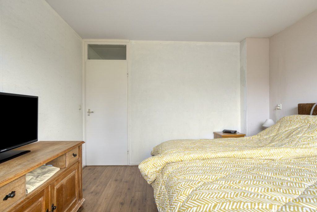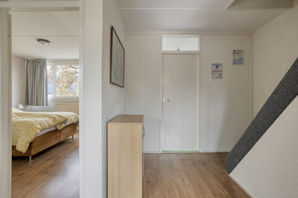 Op de eerste verdieping zijn drie slaapkamers en een badkamer aanwezig. De slaapkamer aan de achterzijde heeft een vrij uitzicht. Daarnaast is er aan de voorzijde een extra ruimte die, na aanpassing van de trap, geschikt te maken is als extra slaapkamer. De badkamer is eenvoudig uitgevoerd en beschikt over een toilet, douche, vaste wastafel en een wasmachineaansluiting.
