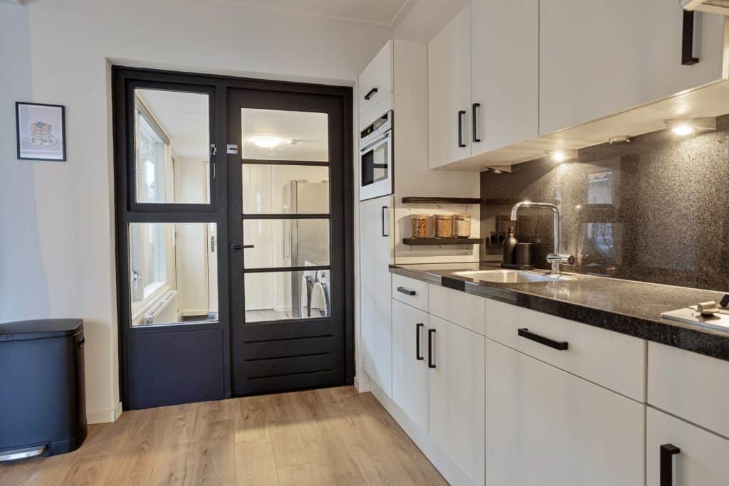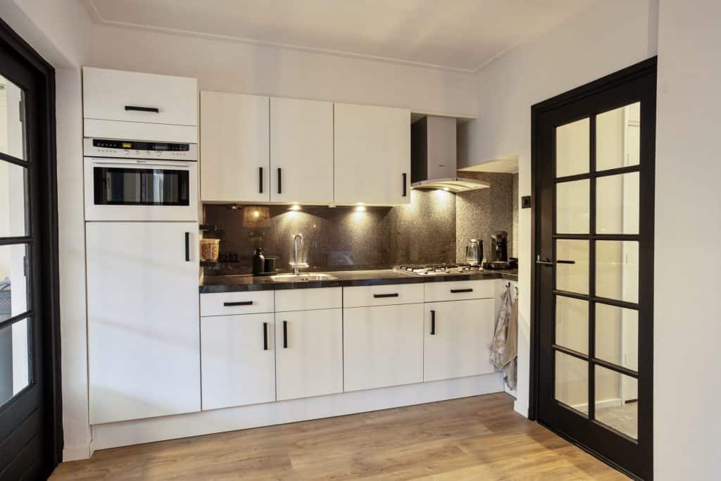 De voormalige dichte keuken is bij de woonkamer gevoegd. Dit geeft visueel meer woonoppervlakte. De open keuken is uitgevoerd in een lichte kleurstelling, is voorzien van een natuurstenen blad en ook is de keuken voorzien van alle benodigde inbouwapparatuur.