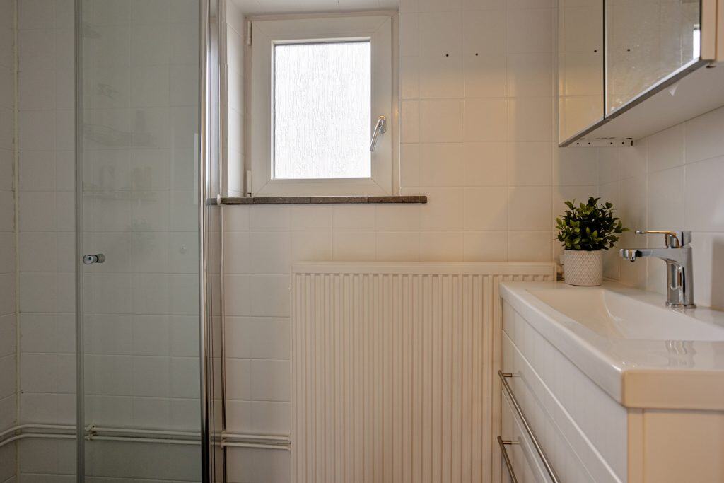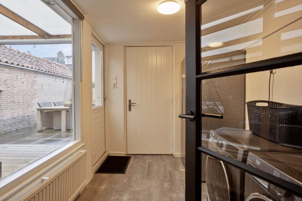 Vanuit de keuken loop je door naar de praktische, aangebouwde bijkeuken. Hier vind je het aansluitpunt voor de wasapparatuur. Vanuit de bijkeuken kun je het overdekte terras op en de schuur in.