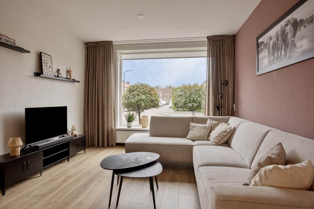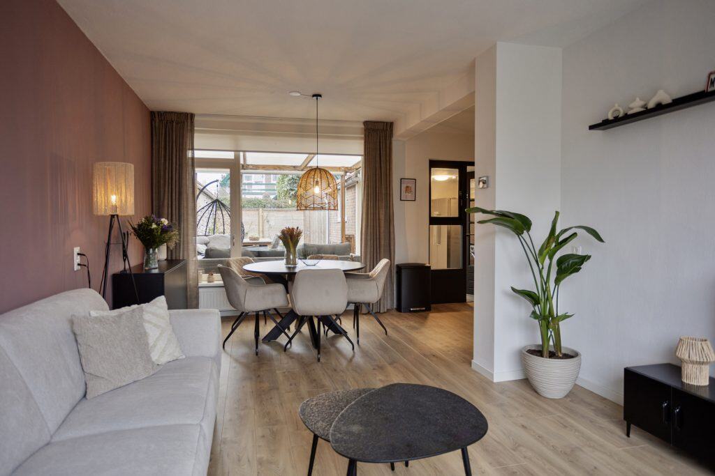 Via de entree kom je in de hal met trapkast, het gemoderniseerde toilet en toegang tot de woonkamer. De woonkamer is meteen al een prettige ruimte met veel lichtinval en een mooie vloer. Aan de voorzijde is er ruimte genoeg voor je zithoek en je hebt hier een leuk uitzicht over het straatbeeld. Achterin de woonkamer vind je ruimte genoeg voor een eettafel met uitzicht over de tuin en de veranda.