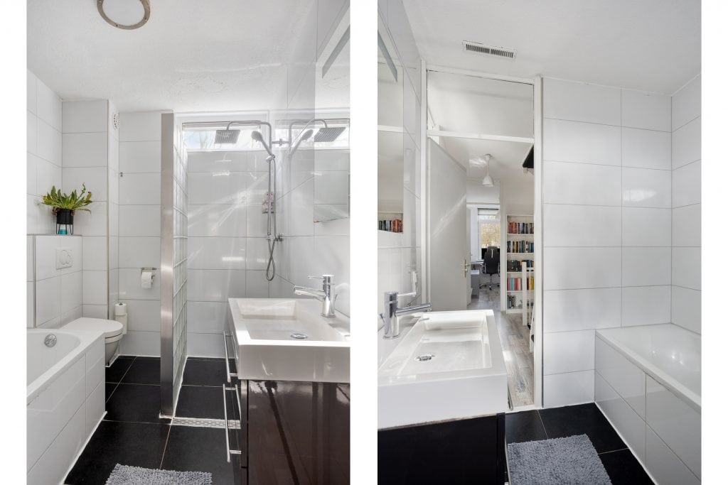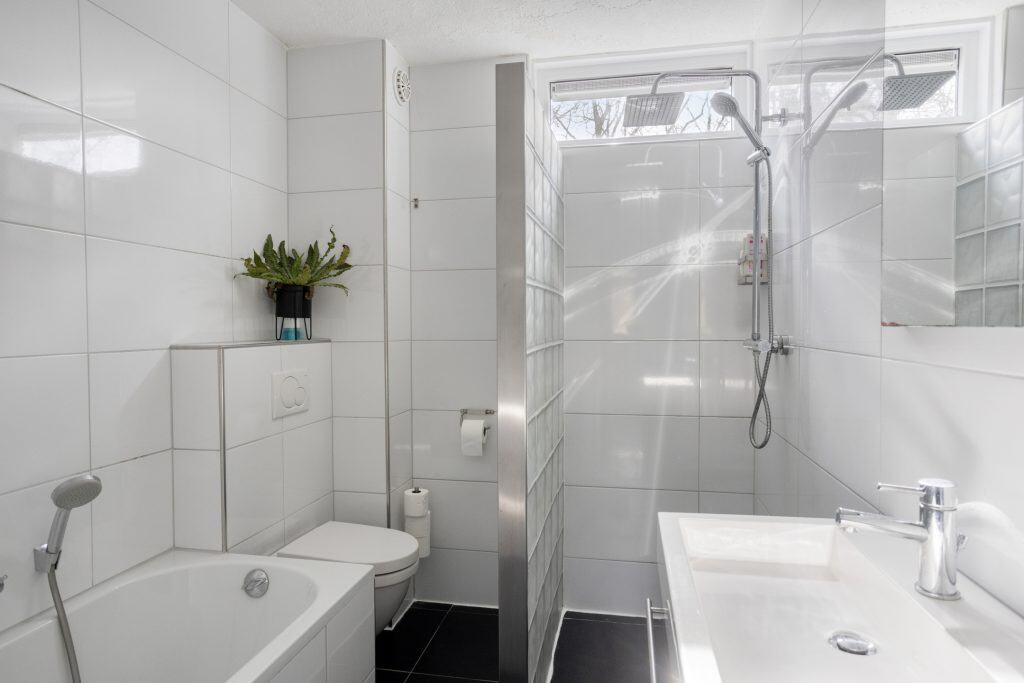 We nemen de trap naar de 1e verdieping. Hier vind je drie slaapkamers en de badkamer. Alle drie de kamers hebben een prima oppervlakte en zijn netjes afgewerkt. De badkamer is compleet uitgevoerd met een ligbad, een wastafelmeubel, een inloopdouche en een 2e toilet.