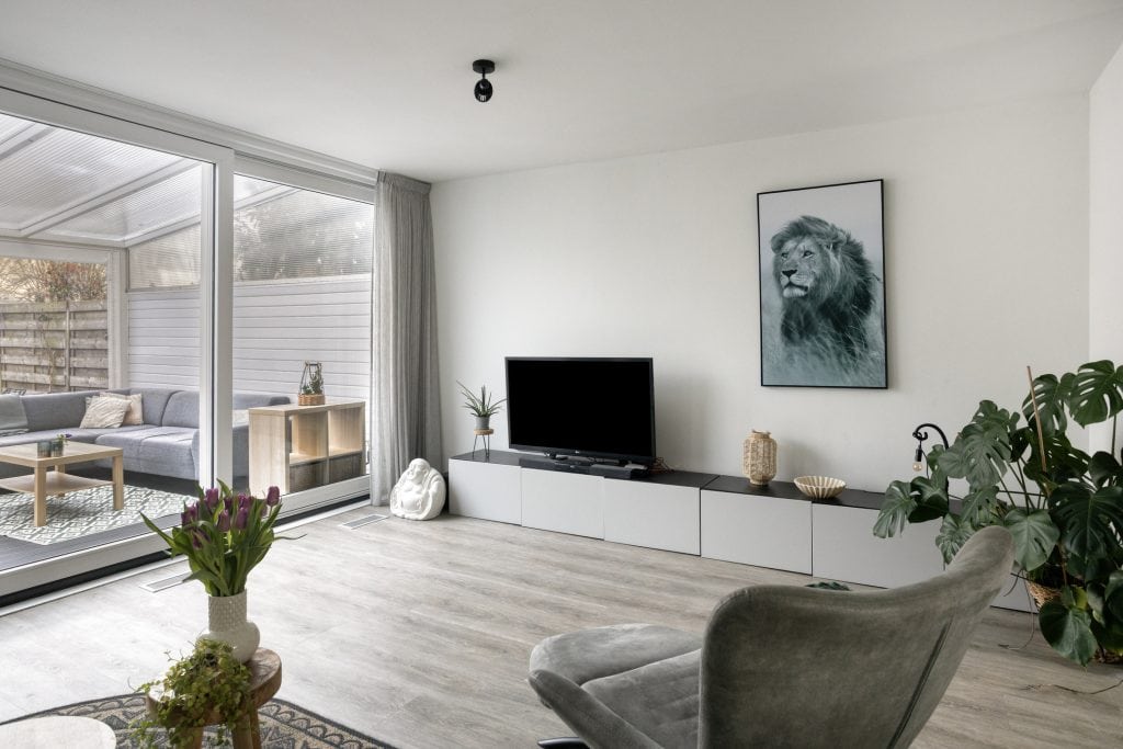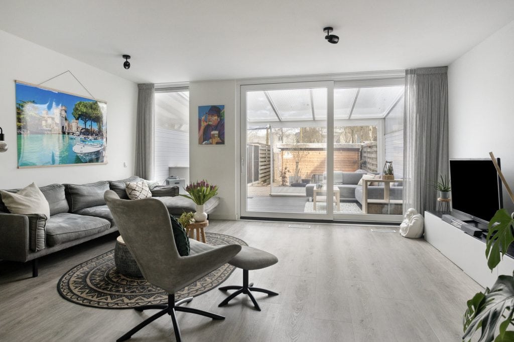 Je komt binnen in de ruime hal, hier vind je de trap naar de verdieping en het toilet. Via de hal kom je in de woonkamer. De woonkamer is een prettige ruimte met een mooie vloeroppervlakte. Er ligt een fraaie pvc-vloer, de wanden zijn gestukt en er is veel lichtinval. Er is een schuifpui naar een grote veranda. Echt een verlengstuk van je woonkamer, hier kun je tot de late uurtjes lekker buiten zitten.