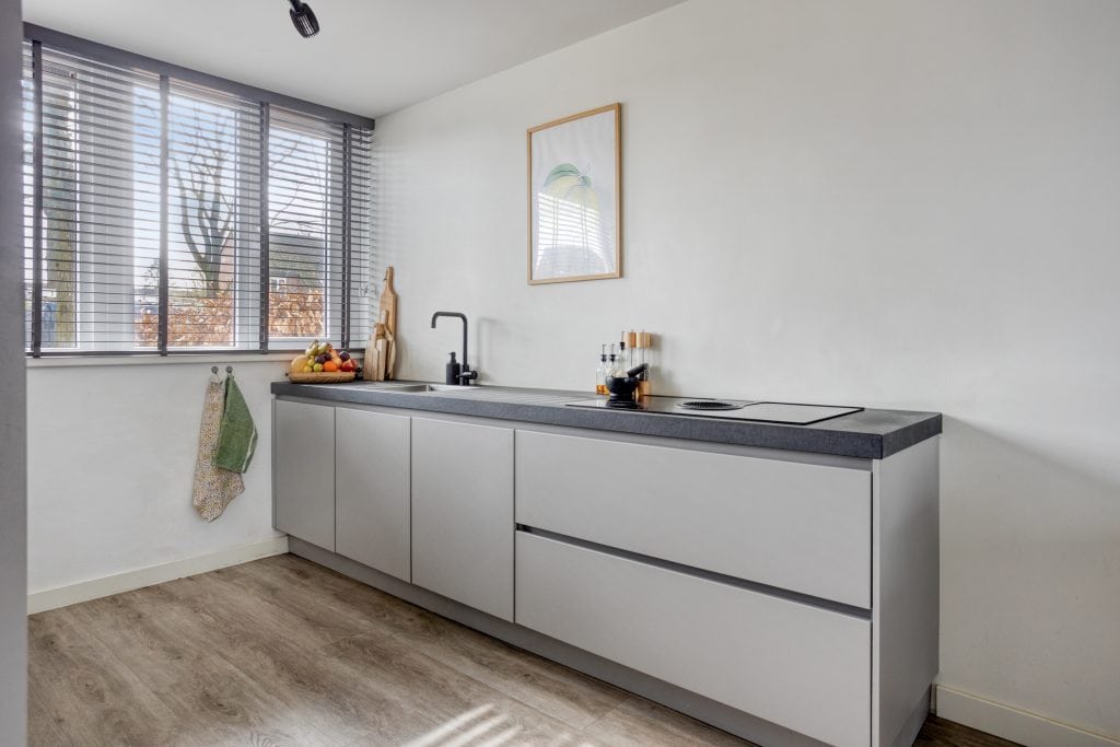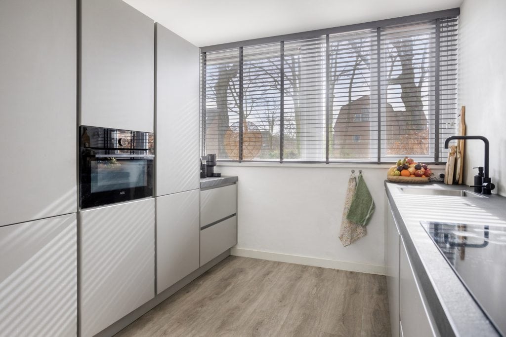 De moderne open keuken is straatgericht en ziet er top uit! Het keukenblok is in rechte opstelling, heeft een mooi aanrechtblad en alle inbouwapparatuur die je nodig hebt. En er is een wand met apparatuur en extra bergruimte.