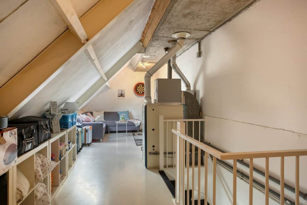 Via een vaste trap is de tweede verdieping bereikbaar. Ook deze zolderverdieping is verrassend ruim. Deze ruimte wordt momenteel gebruikt als berging en hier vind je ook de wasmachine-aansluiting en de heteluchtverwarmingsketel. Tevens is er nog een zithoek. Je zou hier ook nog prima een extra kamer kunnen creëren.