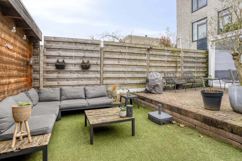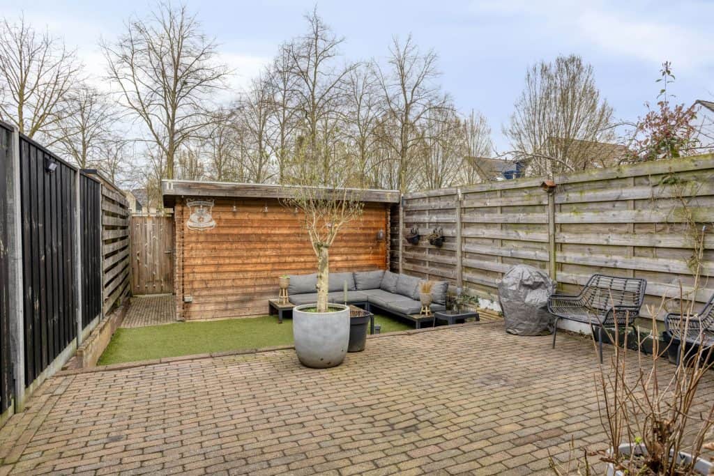 Buiten: de tuin is verzorgd, onderhoudsvriendelijk en lekker vrij gelegen. Er is een groot terras direct bij de woning en achterin de tuin is er ook nog een leuk zitje. Tevens is er een grote houten schuur en een poort met een achterom. Ook aan parkeren is gedacht, zo is er direct achter de woning voldoende parkeergelegenheid. En er is een speelveldje gesitueerd, super kindvriendelijk dus!