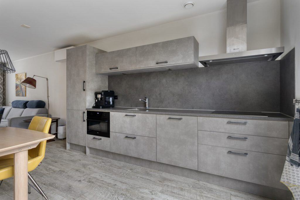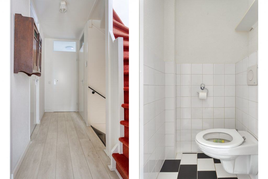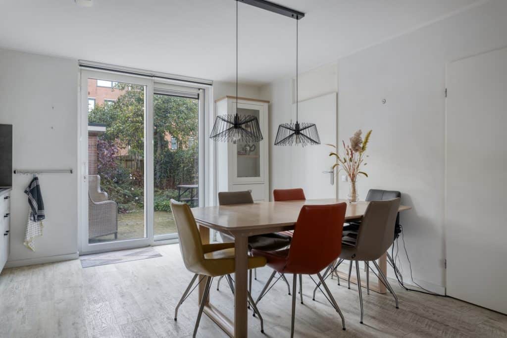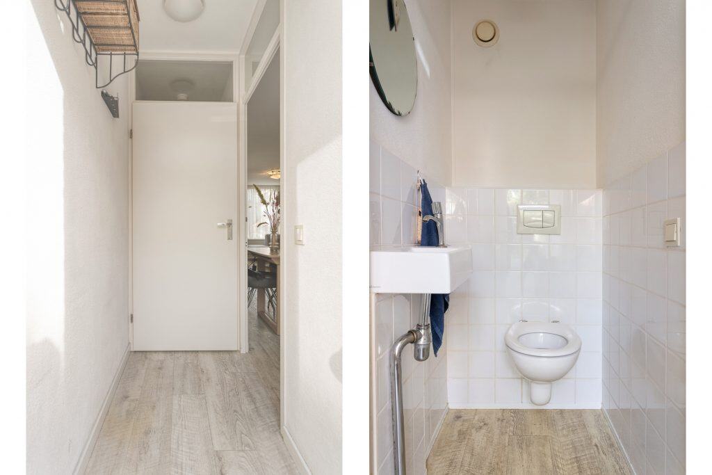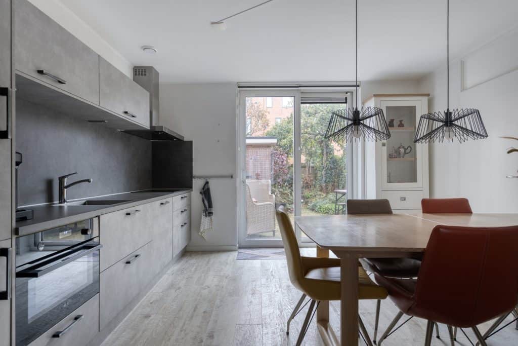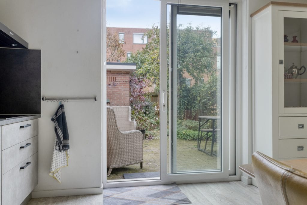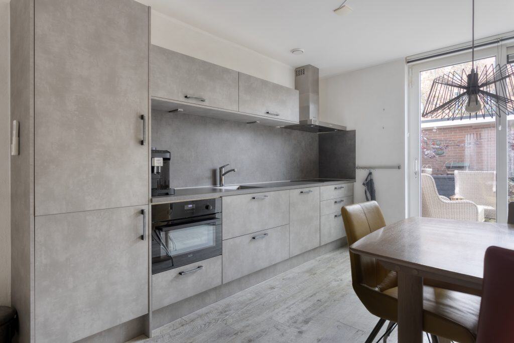 De moderne, open keuken ligt aan de achterzijde van de woning, geplaatst in een rechte opstelling en is voorzien van inbouwapparatuur. En er is een schuifpui naar de tuin, lekker tuingericht eten dus! Het toilet bevindt zich in de achter-entree.