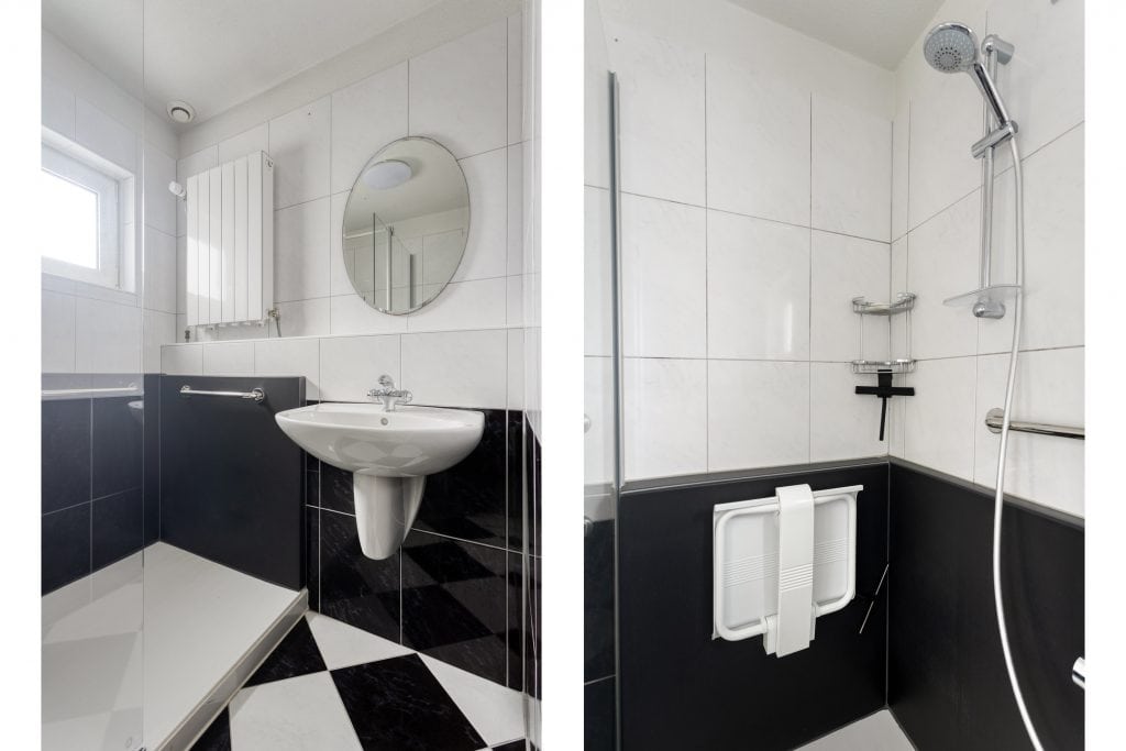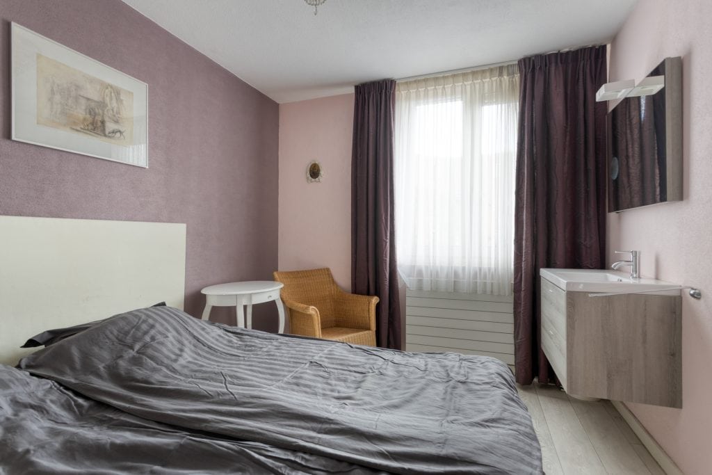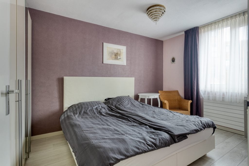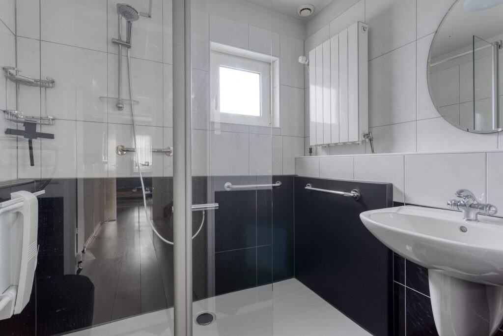 We nemen de trap naar de 1e verdieping. Vanaf de overloop zijn er twee slaapkamers bereikbaar. De slaapkamer aan de voorzijde is echt heel royaal (voorheen twee kamers, hier zou je desgewenst ook weer twee kamers van kunnen maken). De badkamer is netjes en voorzien van een inloopdouche en een wastafel. Er is een separaat toilet op de overloop.