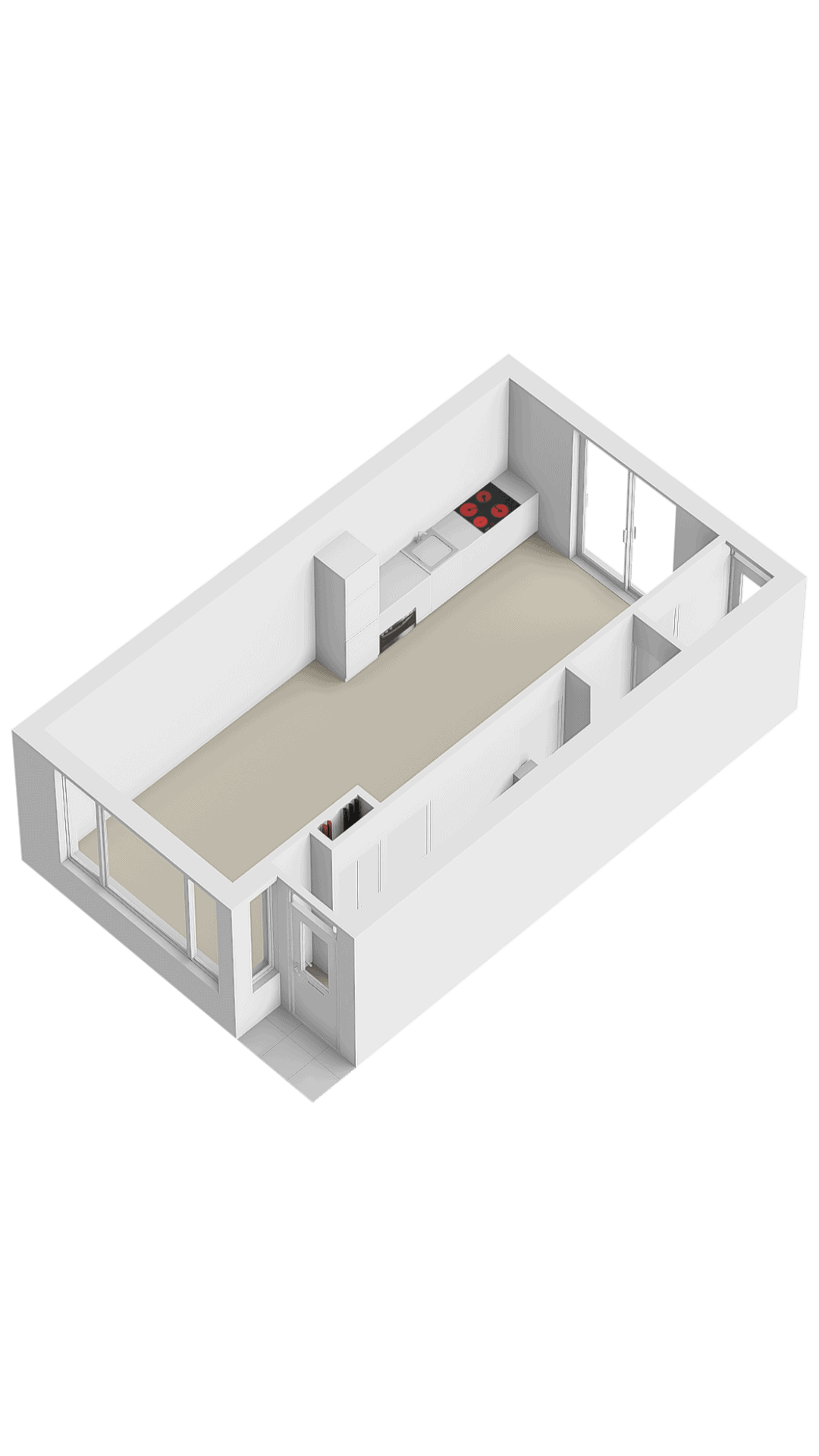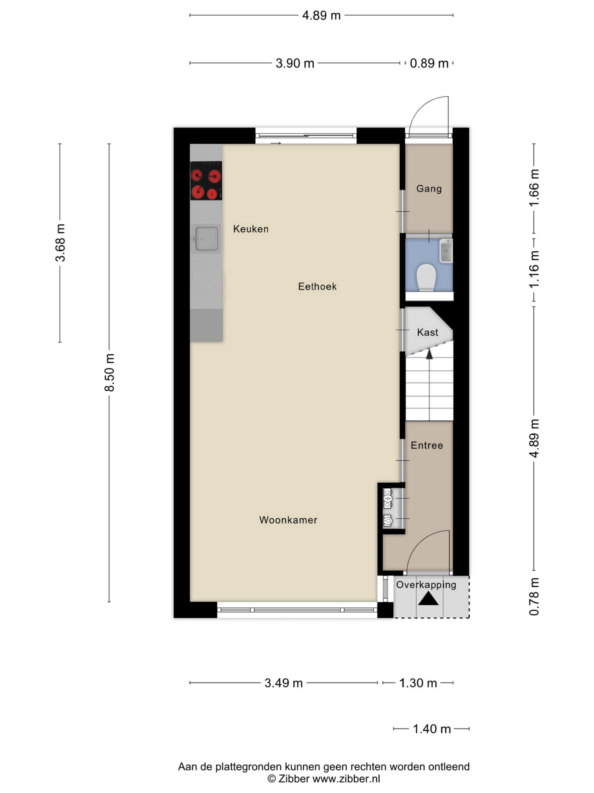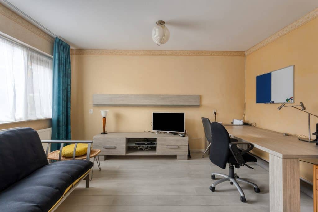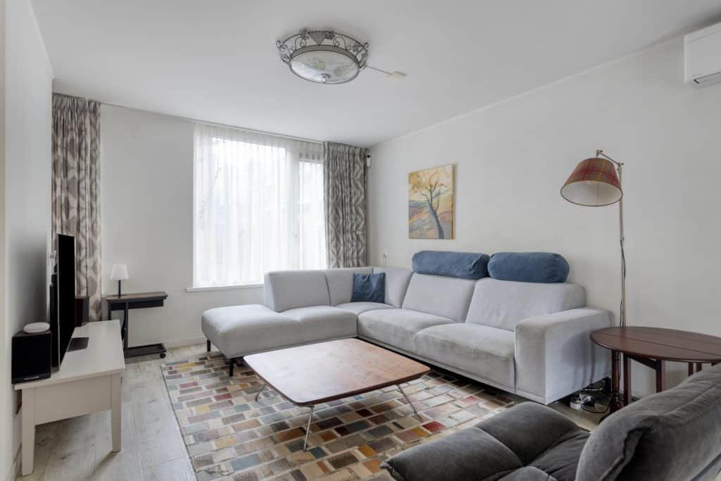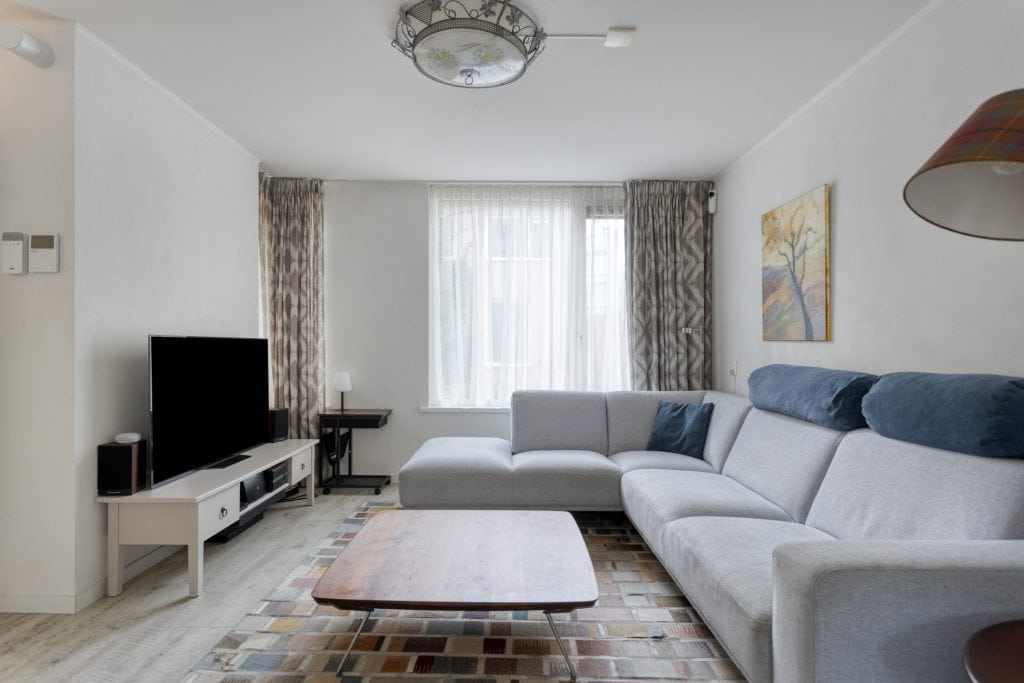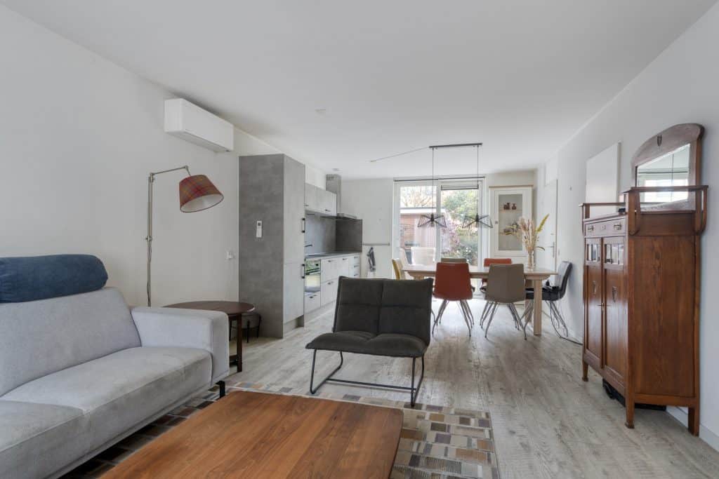 Door de woning heen: we komen binnen in de hal met de meterkast en de trapopgang naar de verdieping. We lopen door naar de woonkamer. De woonkamer heeft een mooie afmeting, er ligt een pvc-vloer met vloerverwarming, er is airco en de wanden zijn in lichte tinten uitgevoerd. Er is voldoende ruimte voor het plaatsen van een zit- en eethoek.