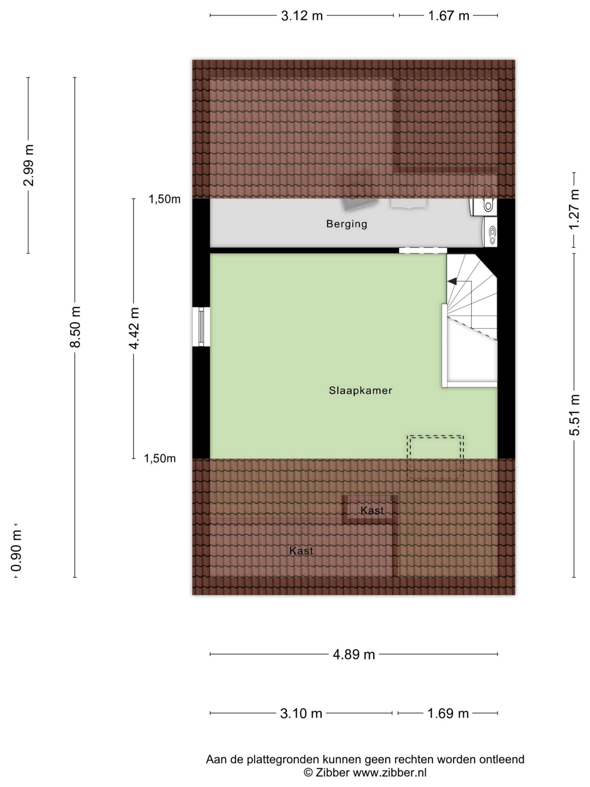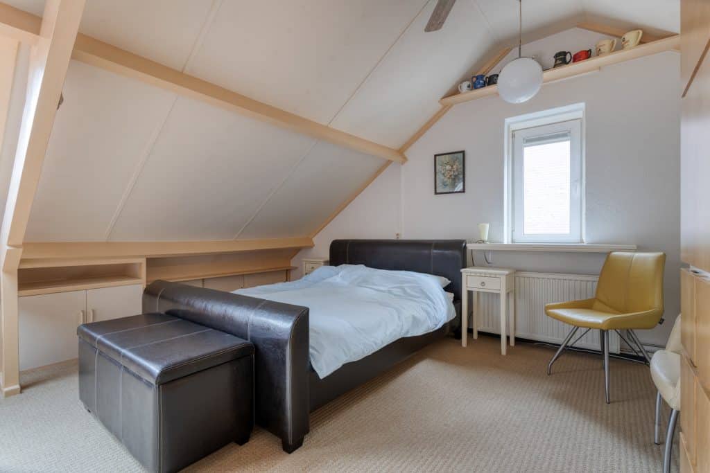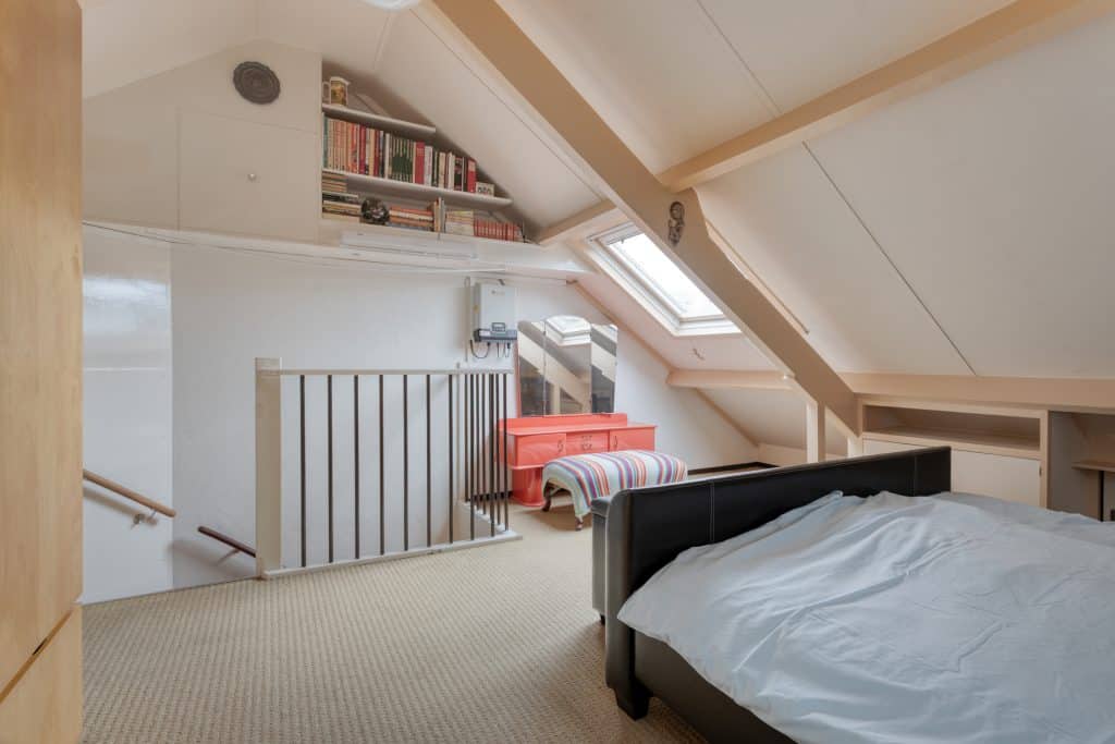Via een vaste trap komen we op de 2e verdieping. Hier vinden we een royale zolderruimte/ slaapkamer voorzien van een dakraam en bergruimte. Verder is er een technische ruimte met de C.V.-ketel en de warmtepomp (Inventum) en de wasmachine-aansluiting.