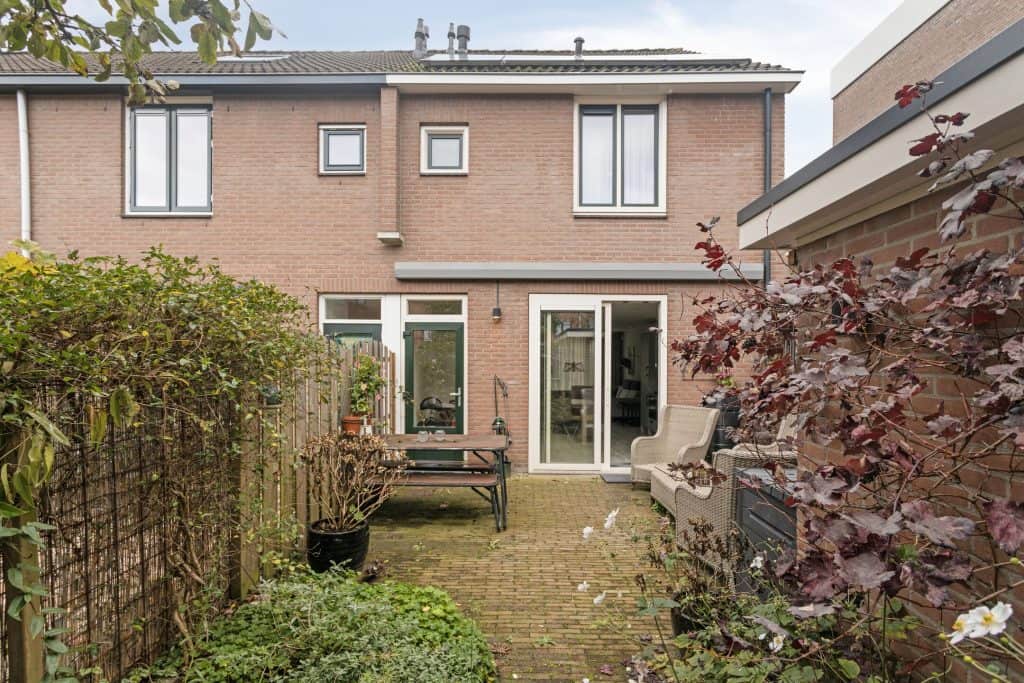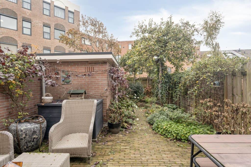 Buiten: de achtertuin is met zorg aangelegd. Er is een terras, sierbestrating en borders met beplanting. Achter in de tuin is er een stenen berging en een achterom.