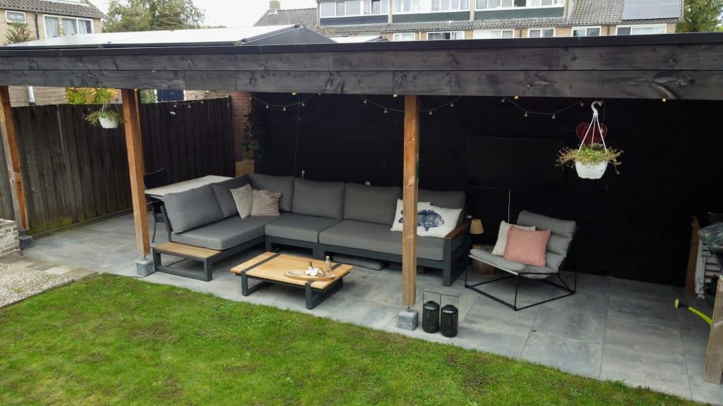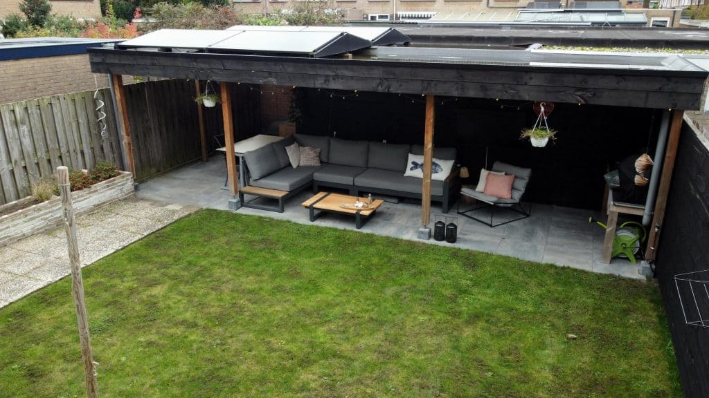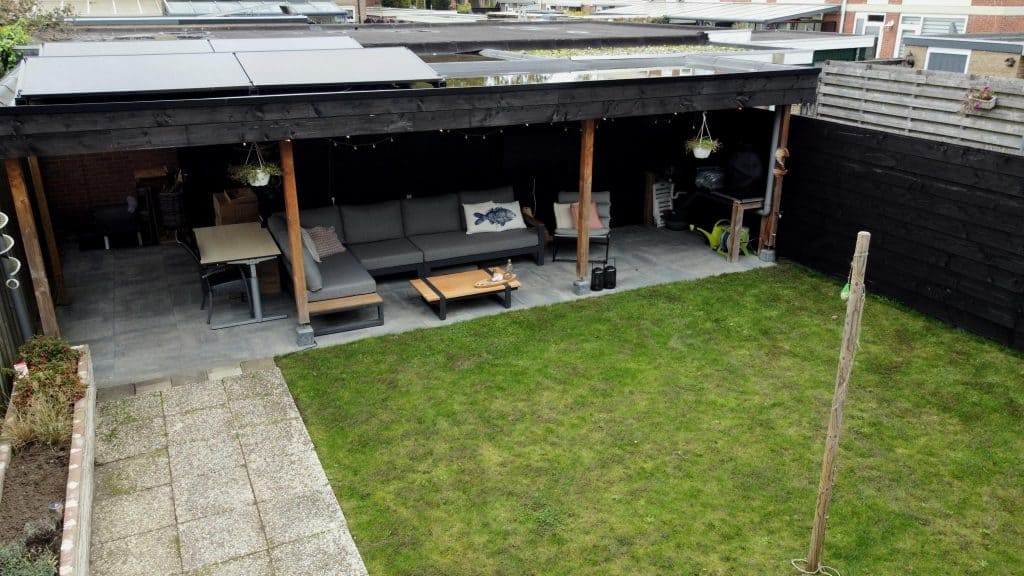 Buiten: de zonnige tuin heeft een royale afmeting en is voorzien van een terras en een groot gazon. Achterin de tuin staat een grote veranda met ernaast een berging. Je kunt hier heerlijk tot de late uurtjes van het buitenleven genieten!