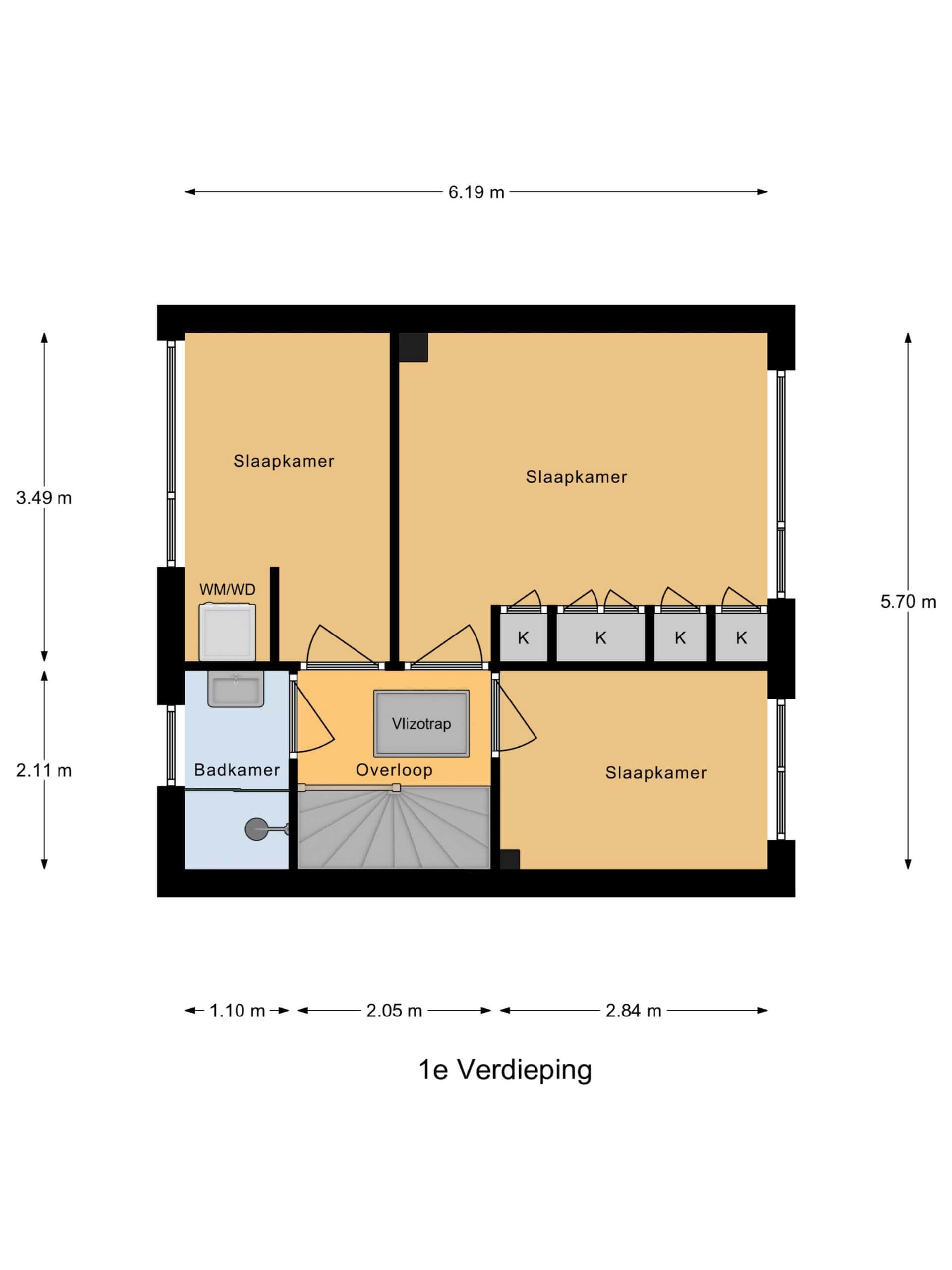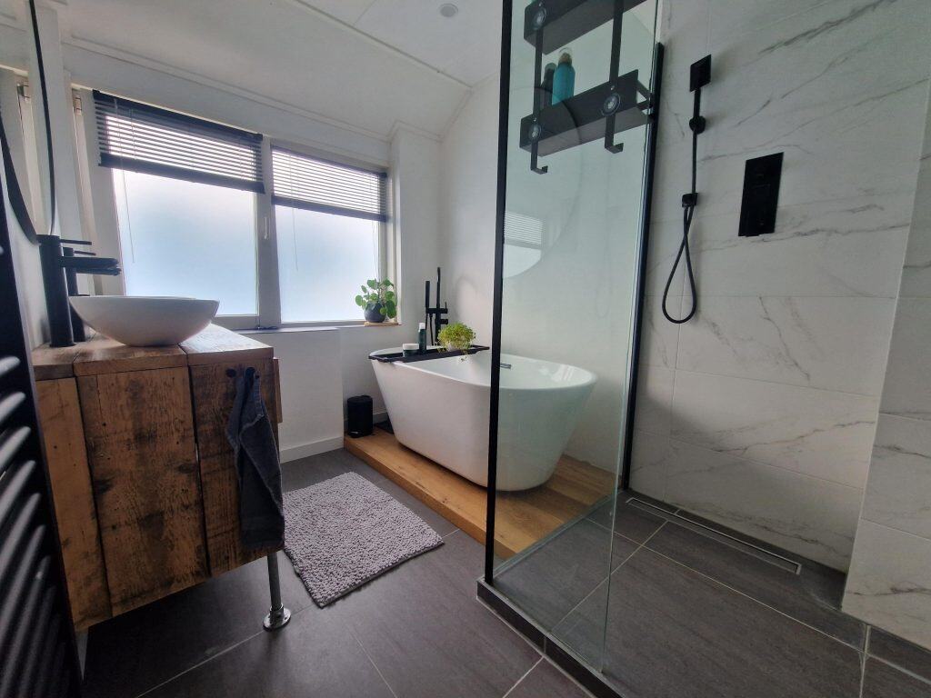We nemen de trap naar de 1e verdieping. Hier vind je twee slaapkamers en de badkamer. De slaapkamers zijn beiden lekker ruim en voorzien van inbouwkasten. De luxe badkamer is uitgevoerd met een inloopdouche, een ligbad en een wastafelmeubel. En er is een aparte ruimte met een 2e toilet en de wasmachine-aansluiting.