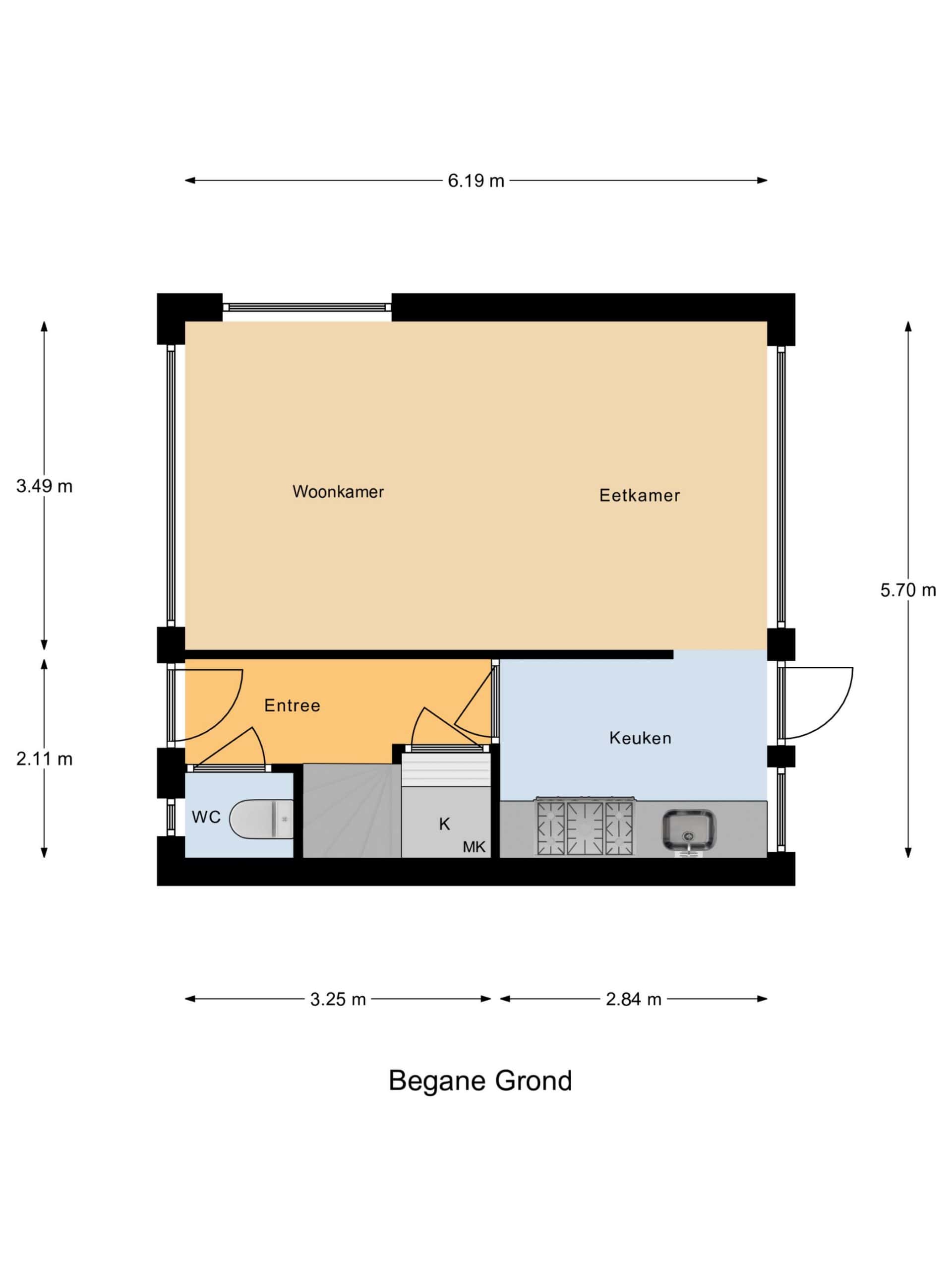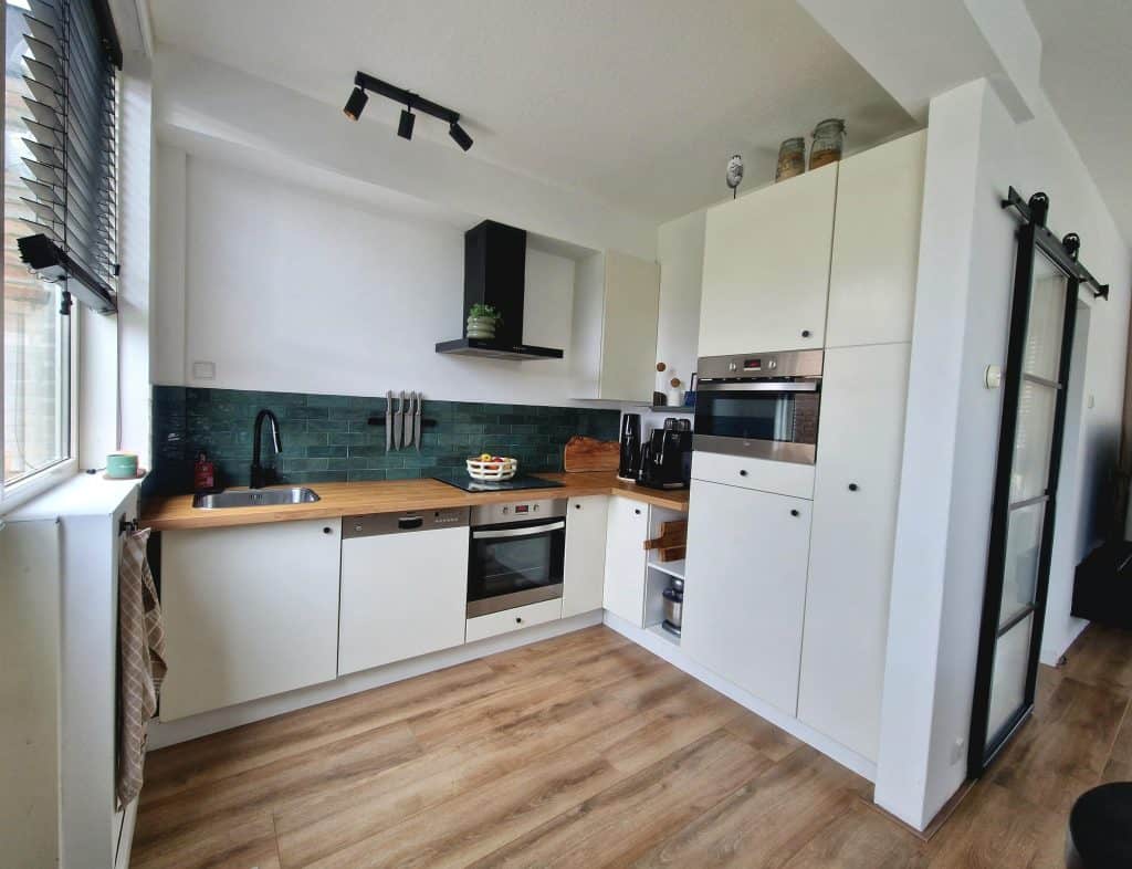Door de woning heen: we komen binnen in de hal met het toilet en de kelderkast. We lopen door naar de woonkamer. De woonkamer heeft vloerverwarming, de wanden zijn in moderne tinten afgewerkt en er ligt een laminaatvloer. Er is voldoende ruimte voor het plaatsen van een eet- en zithoek. De open keuken is aan de achterzijde gesitueerd, is in L-vorm opgesteld en voorzien van inbouwapparatuur.