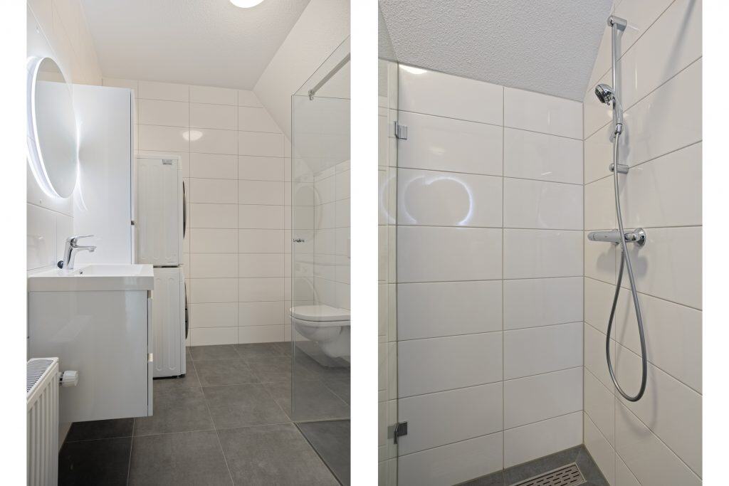 Via een mooie brede trap kom je op de eerste verdieping. Hier zien we hetzelfde hoogwaardige afwerkingsniveau; er zijn twee keurig afgewerkte slaapkamers, beiden voorzien van een frans balkon. De slaapkamer aan de voorzijde beschikt over vaste kastruimte. De 2e badkamer heeft een douchehoek, een wastafelmeubel, een 2e toilet en hier vind je ook de wasmachine-aansluiting.