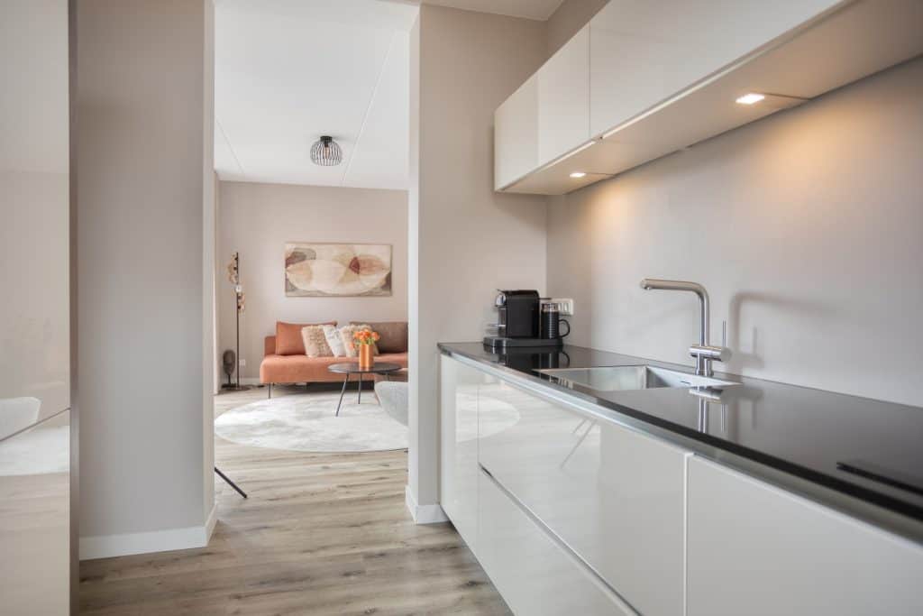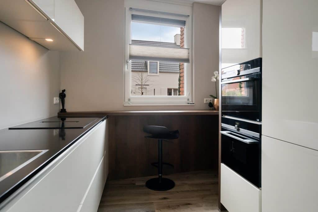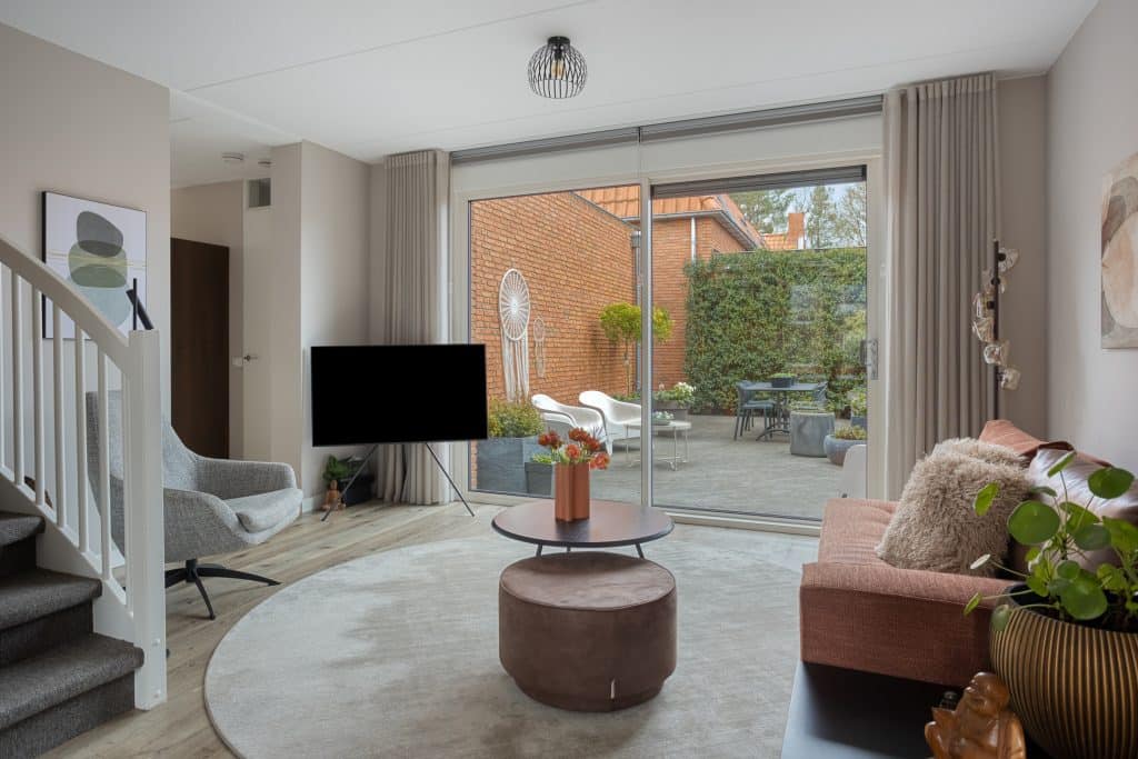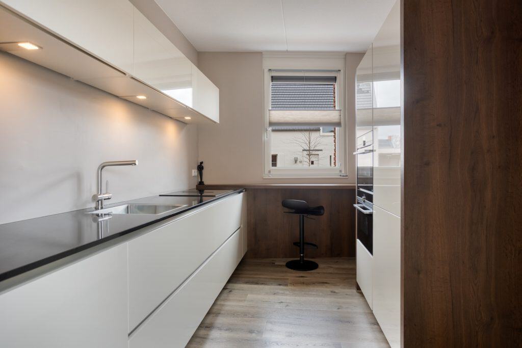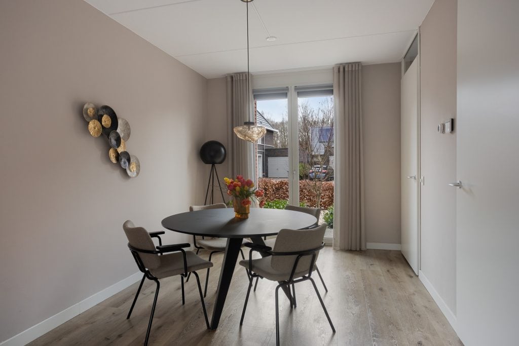 We komen binnen in de hal met toegang tot het moderne toilet en de meterkast. Vanuit de hal komen we in de woonkamer; een sfeervolle ruimte. Je zit hier tuingericht en door de grote schuifpui en glaspartij heb je een onbelemmerd zicht op de mooie tuin. De wanden zijn gestuukt en er ligt een mooie pvc-vloer, met vloerverwarming. Er is voldoende ruimte voor het plaatsen van een zit- en eethoek. En onder de trap is er een ruime bergkast. We lopen door naar de keuken. De moderne keuken heeft een luxe keukeninrichting met een fraai dun blad en is voorzien van alle benodigde inbouwapparatuur. Er is een keukenblad in een rechte opstelling en een wand met apparatuur en bergruimte. En voor het raam is er een zitje waar je ’s ochtends lekker je botterhammetje kan eten!