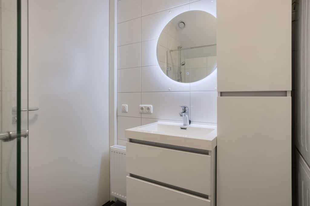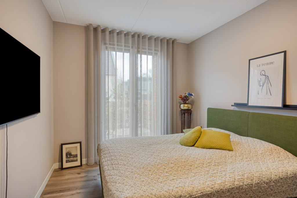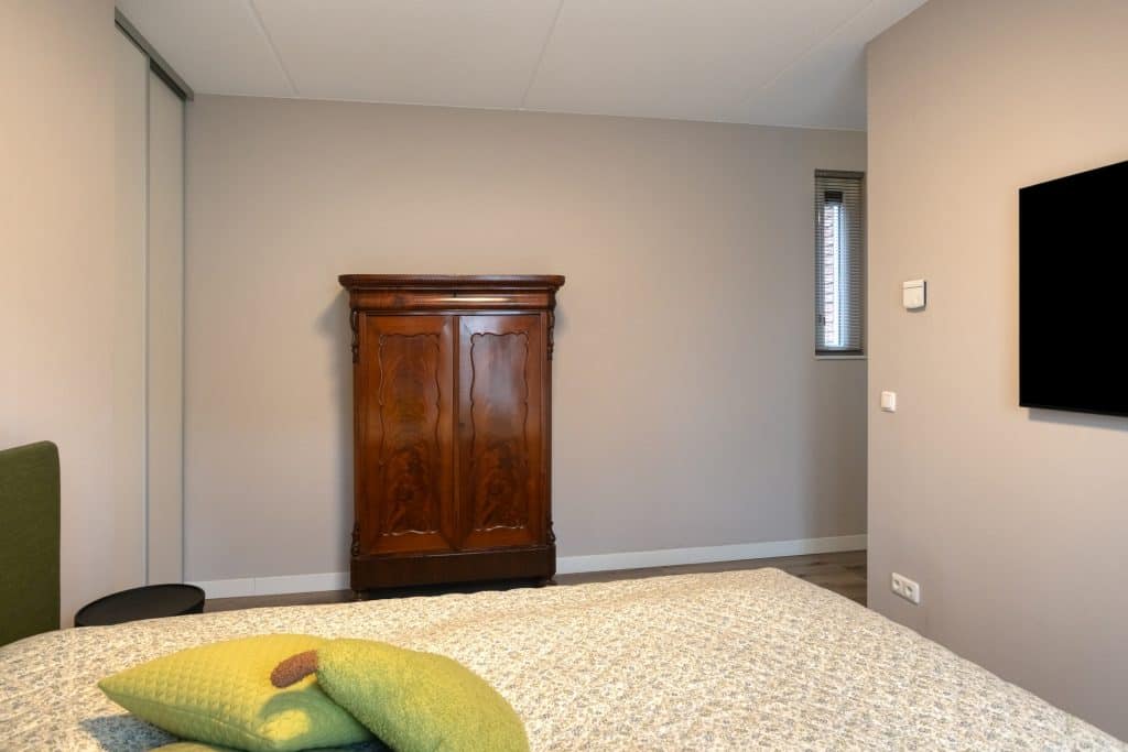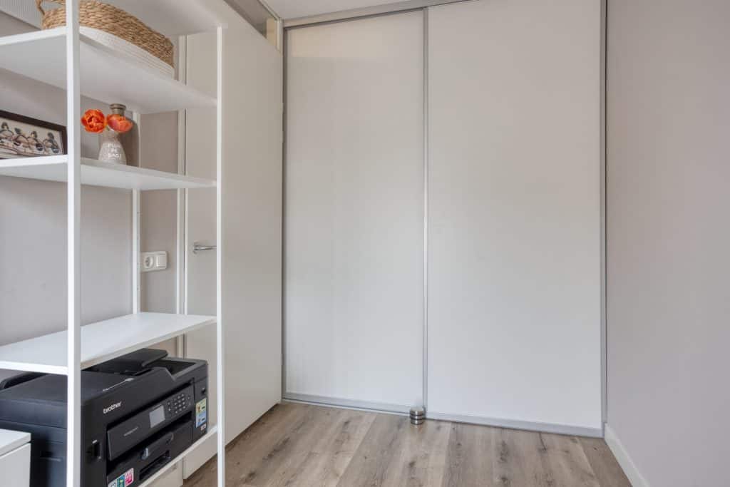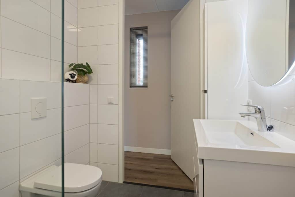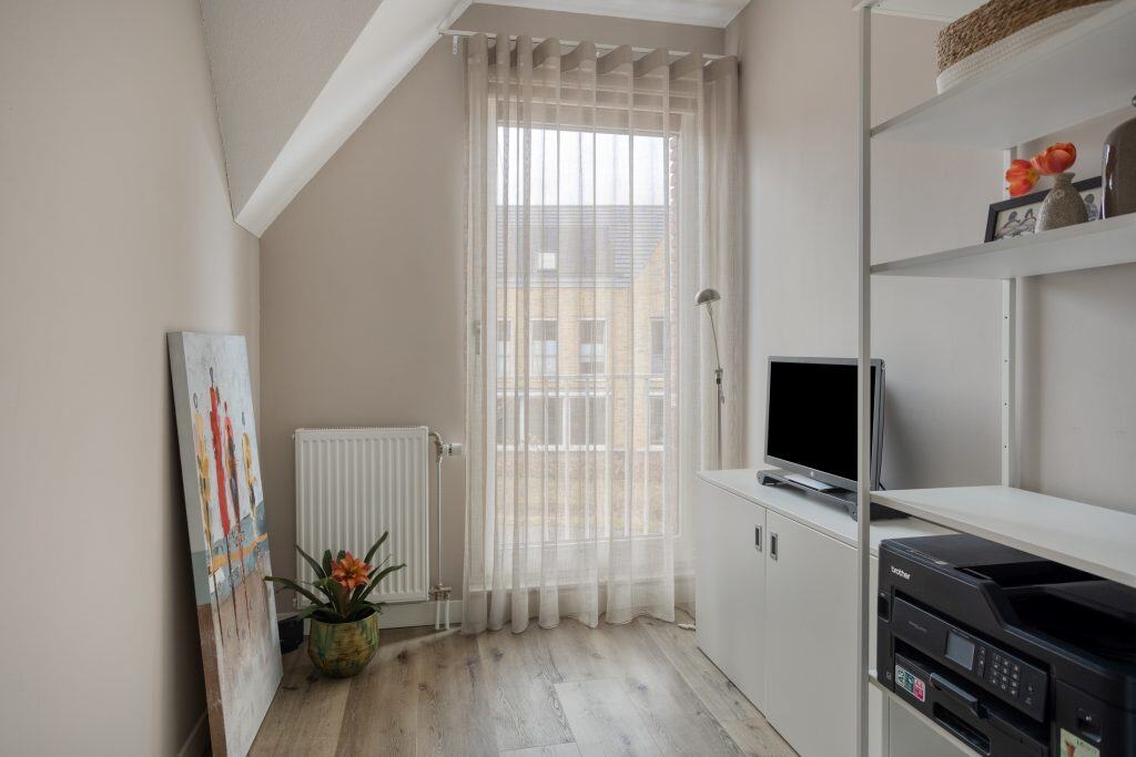 Ook vinden we op de begane grond een ruime slaapkamer met een inloopkast en openslaande deuren naar een klein terras. En er is een badkamer met een inloopdouche, een wastafelmeubel en een toilet. Levensloopbestendig wonen behoort hier dus tot de mogelijkheden.