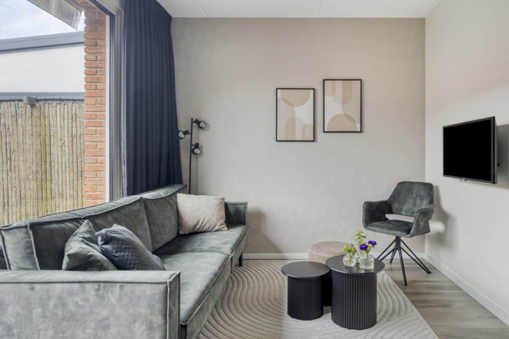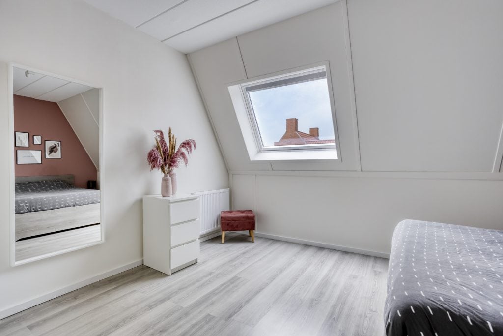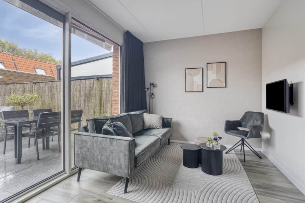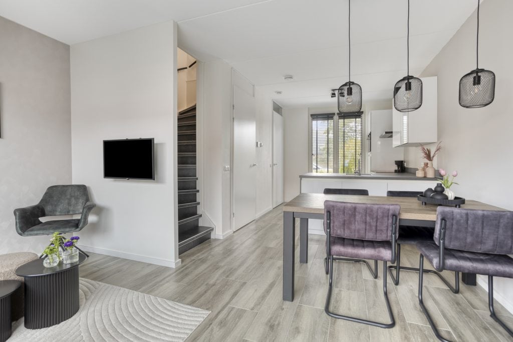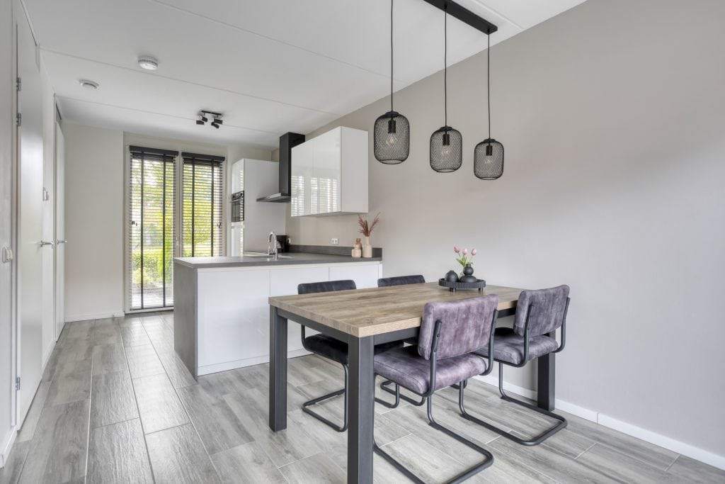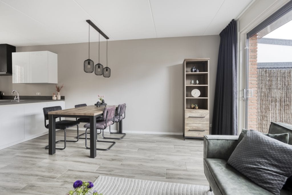 Aan de achterzijde van de woning tref je de woonkamer. Hier heb je ruimte voor een eettafel en een zithoek. Via de grote schuifpui, die zorgt voor veel lichtinval, loop je zo de tuin in.