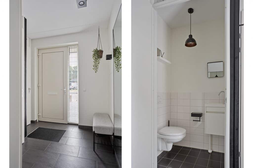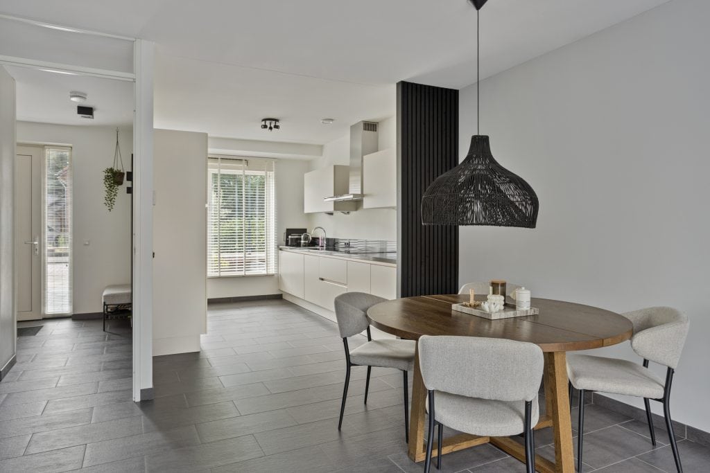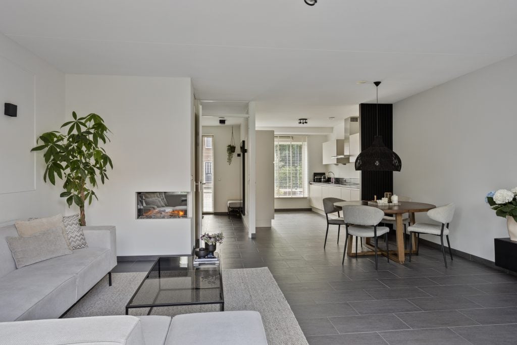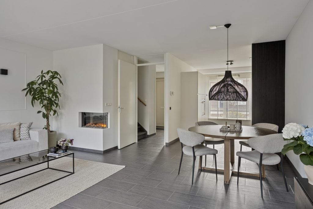 Door de woning heen: we komen binnen in de hal met de meterkast, het toilet en een garderoberuimte. We lopen door naar de woonkamer. Wat direct opvalt in deze woning is de ruimte en de lichtinval. De woonkamer is echt royaal en lekker tuingericht. Er is voldoende ruimte voor het plaatsen van een grote zithoek. De wanden zijn keurig afgewerkt, er is een sfeervolle elektrische haard en er ligt een plavuizenvloer met vloerverwarming. En er zijn openslaande deuren naar de tuin.