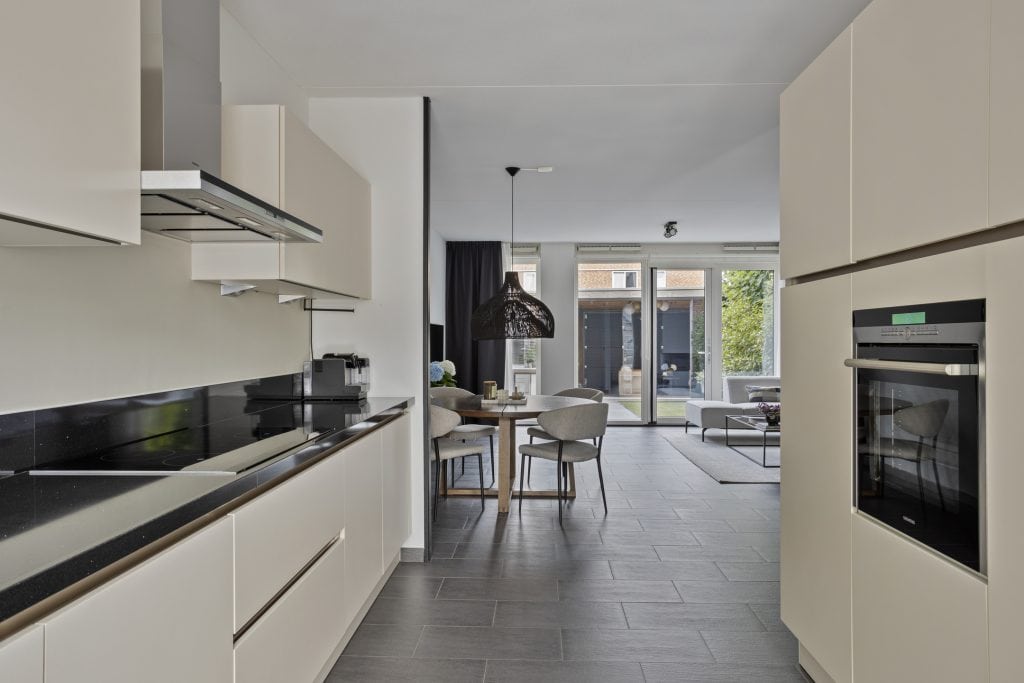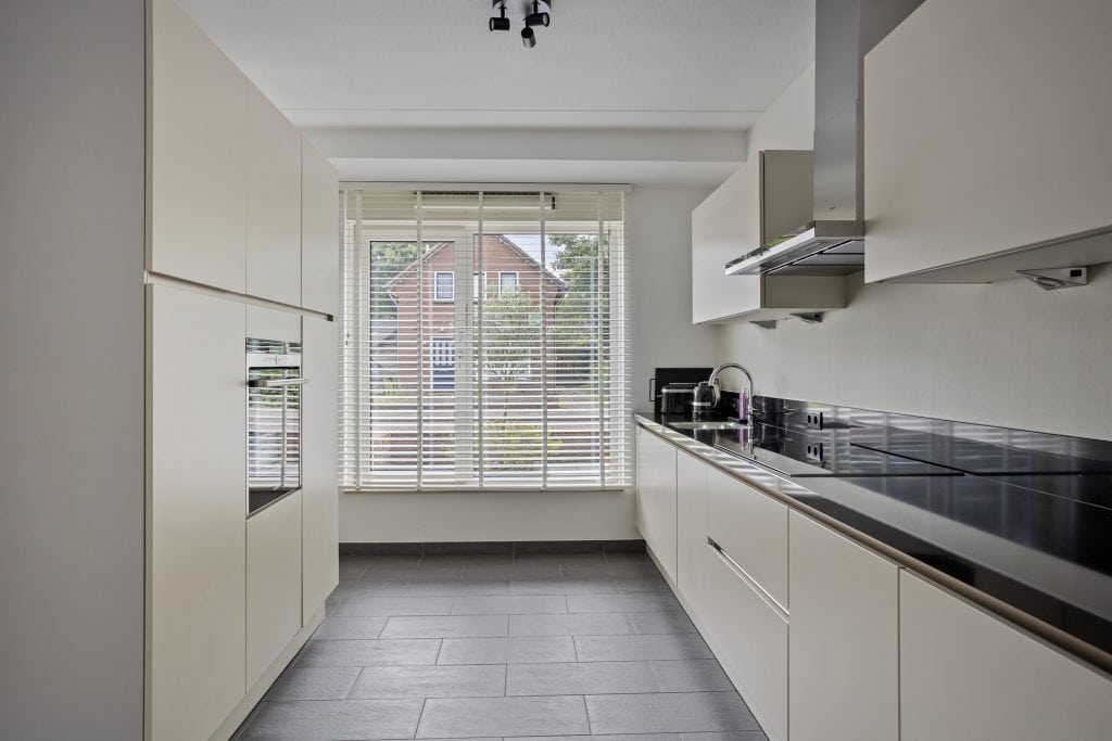 De luxe keuken bevindt zich aan de voorzijde en is uitgevoerd in een rechte opstelling. Er is complete inbouwapparatuur, een fraai aanrechtblad, veel bergruimte en een apparatuurwand.