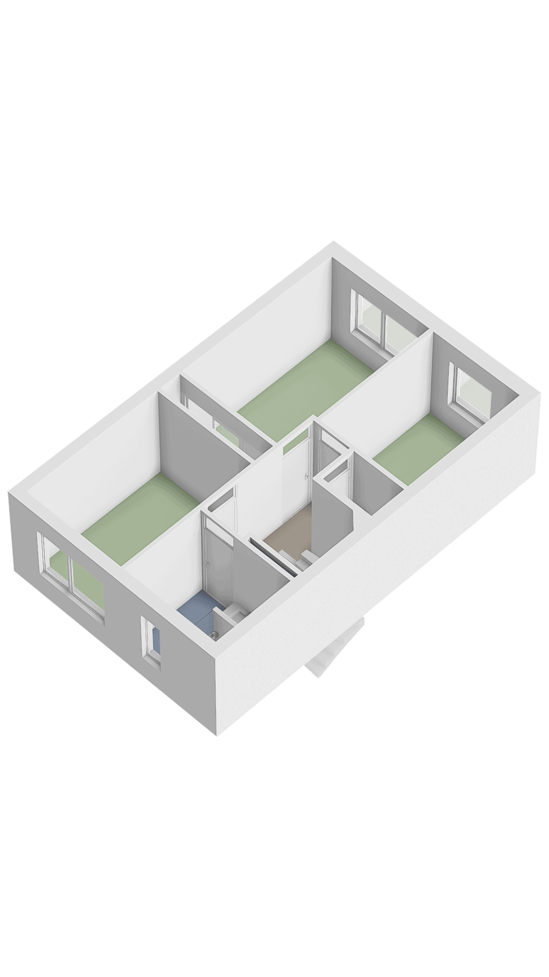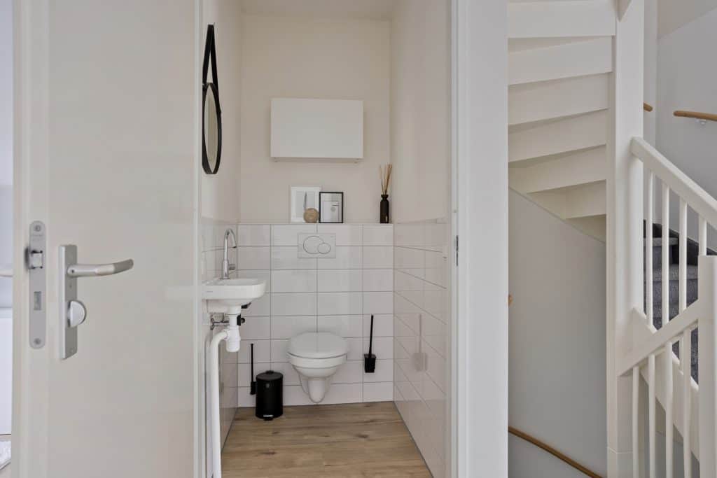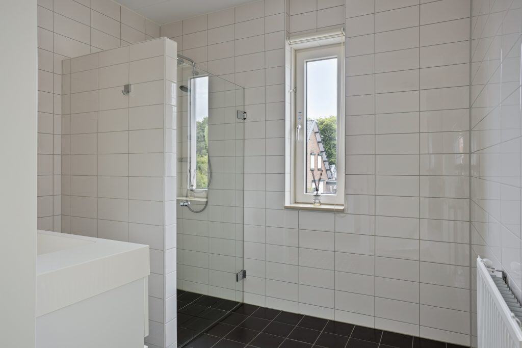 We nemen de trap naar de 1e verdieping. Vanaf de overloop zijn er drie ruime slaapkamers bereikbaar, de badkamer en een separaat toilet. Ook hierboven zien we het zelfde hoogwaardige afwerkingsniveau. Eén slaapkamer heeft een grote vaste kastenwand. En alle kamers zijn voorzien van een laminaatvloer. De moderne badkamer is uitgevoerd met een douche, een wastafelmeubel en een radiator.