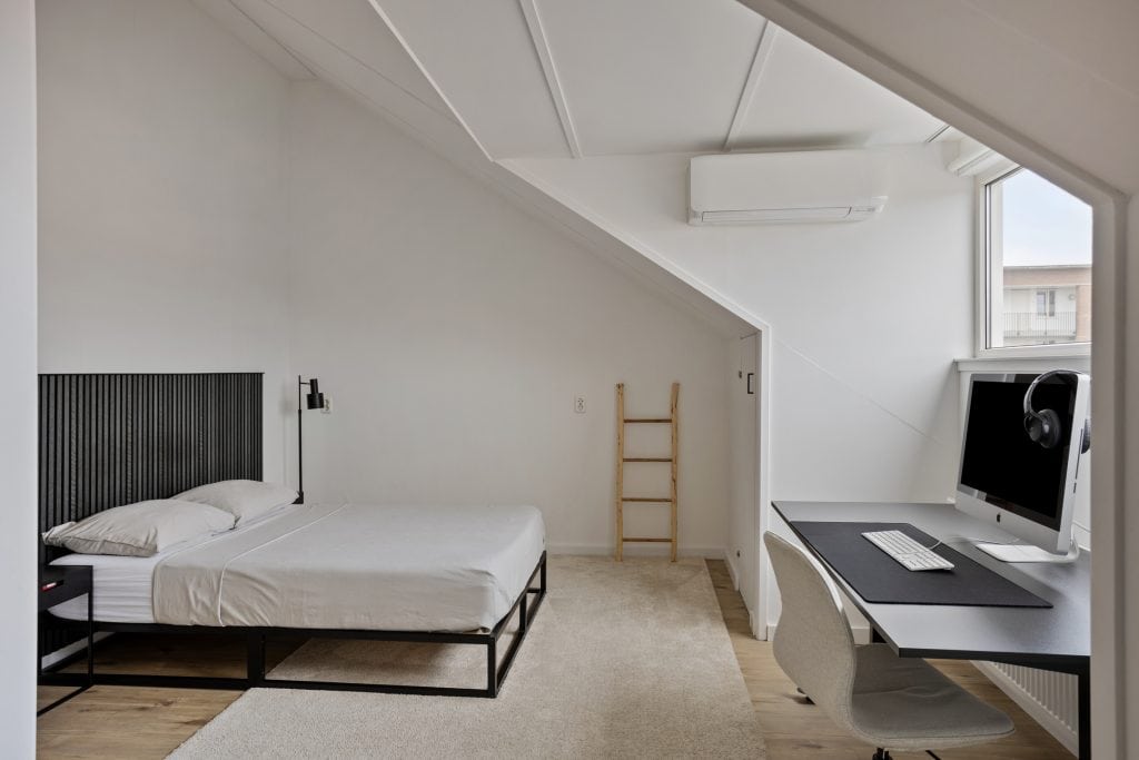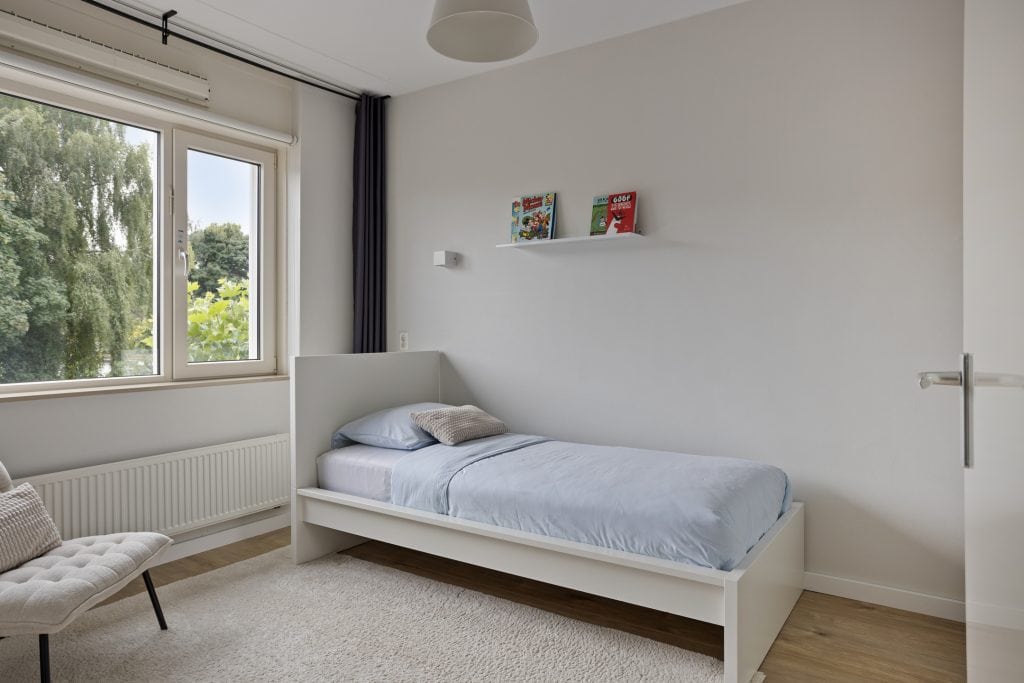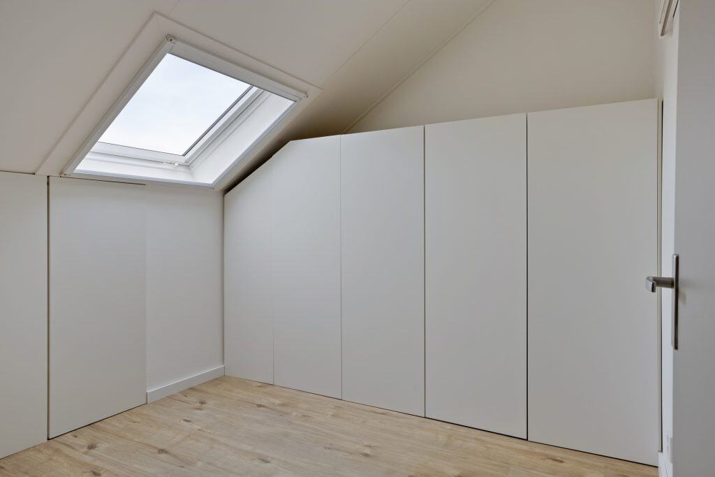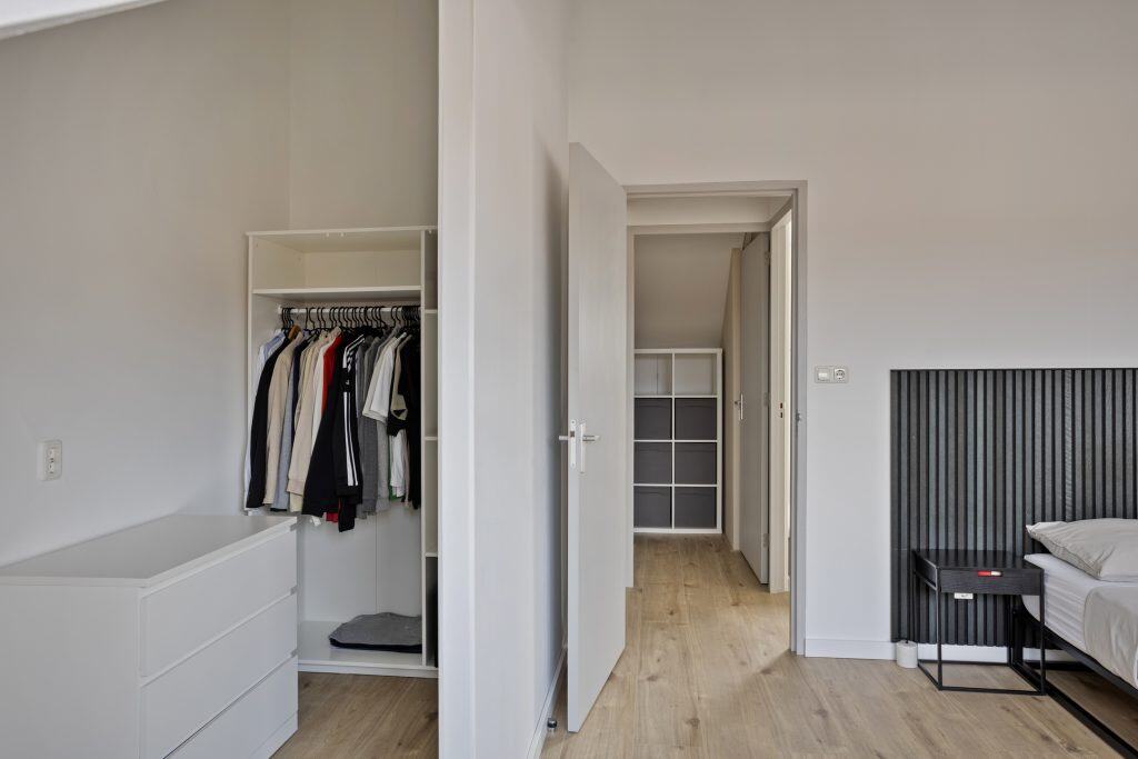 Via een vaste trap komen we op de 2e verdieping. Hier vinden we een prachtige zolderkamer voorzien van een dakkapel en aansluitend een walk-in-closet. En er is airco, heerlijk koel slapen dus! Verder is er nog een kamer met een dakraam en hier is ook vaste kastruimte met de wasmachine-aansluiting. Tenslotte is er een bergkamer met o.a. de c.v.-ketelopstelling (Intergas).