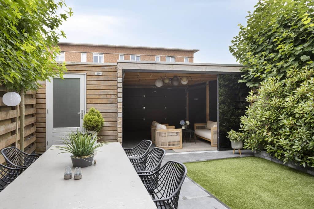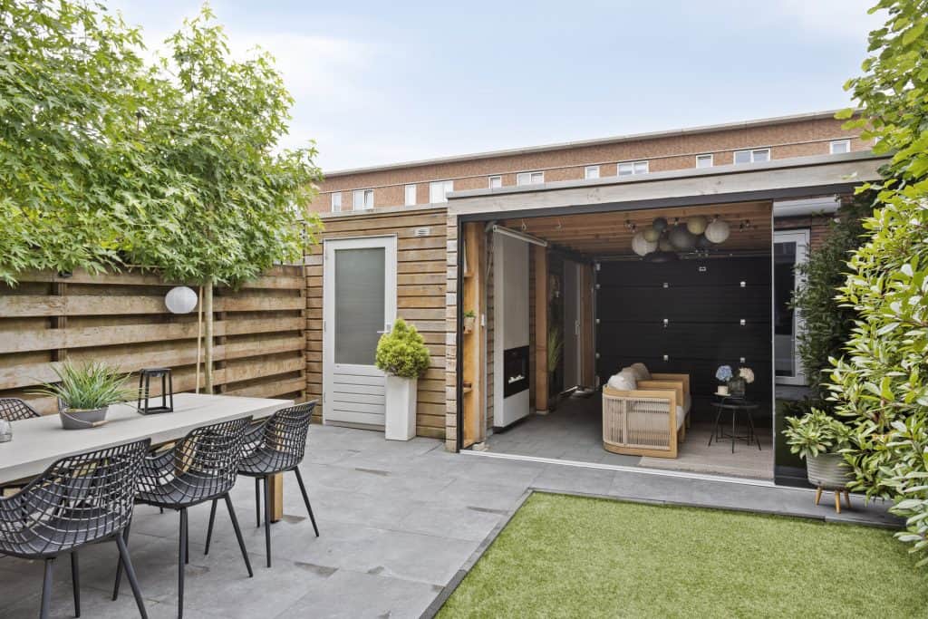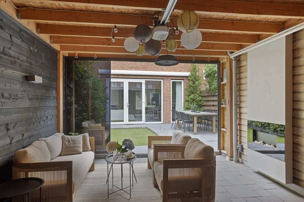 Buiten: de tuin van deze woning is echt een plaatje, heel smaakvol en met zorg aangelegd. Er is een groot terras, borders en een stukje gazon. Voor de zonnige dagen is er een elektrisch bedienbare brede zonwering. Achterin de tuin is er een houten berging met een afsluitbare carport c.q. veranda ernaast. De veranda is van alle gemakken voorzien, er zijn glazen schuifwanden en er is zelfs een leuke haardpartij. Je kunt hier echt tot de late uurtjes van het buitenleven genieten!