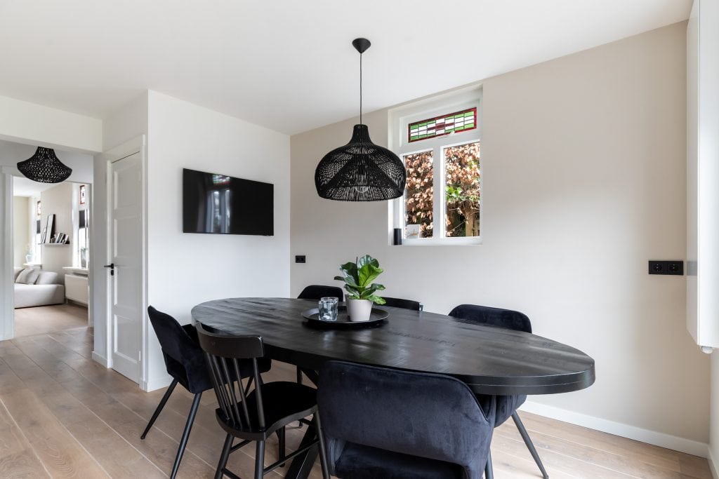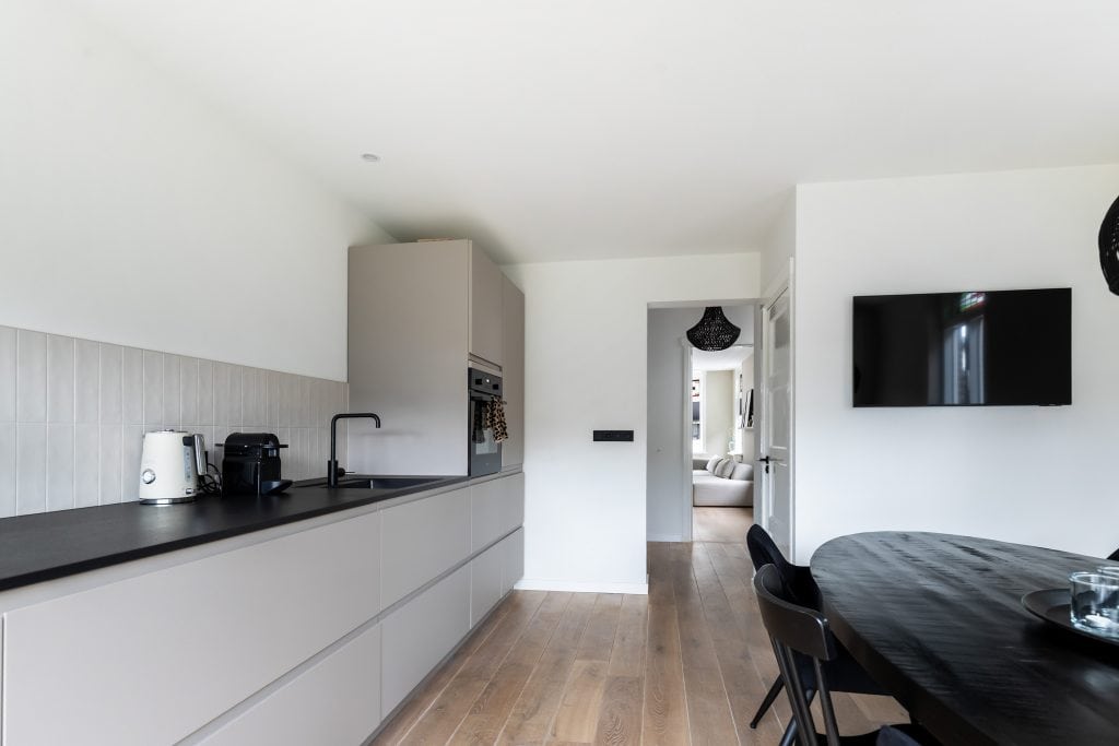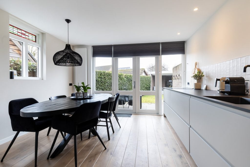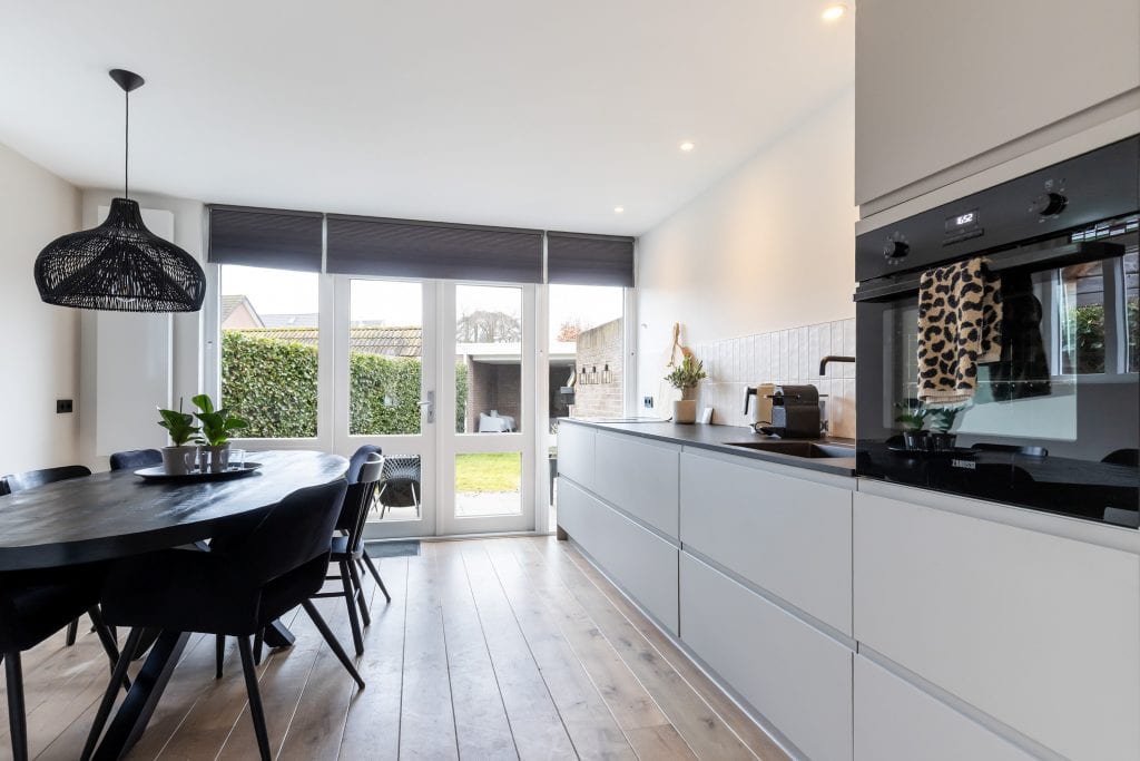 Terug via de hal lopen we door naar de achterzijde van de woning, waar je de moderne, royale en tuingerichte woonkeuken vindt. Een prettige ruimte met veel lichtinval, dubbele tuindeuren naar het terras en oppervlakte genoeg voor een grote eettafel waar je met je familie of vrienden gezellig kunt tafelen.