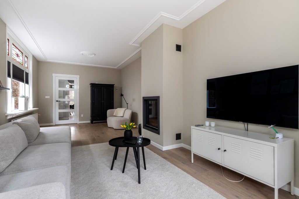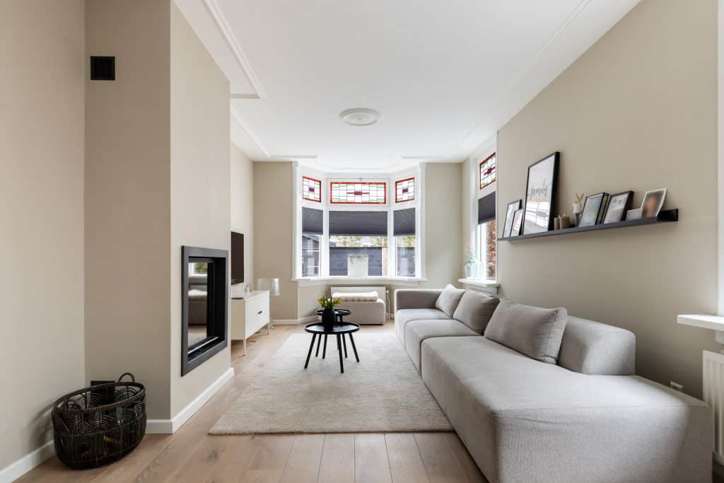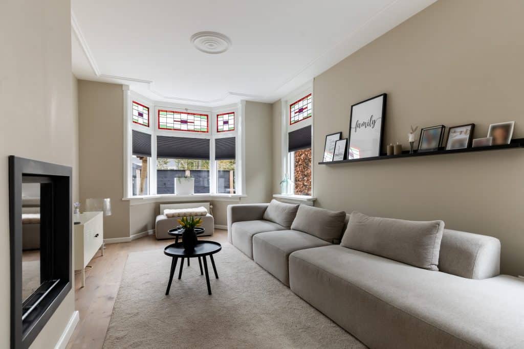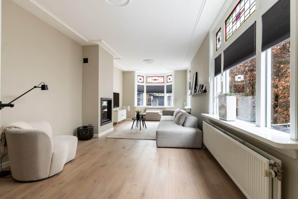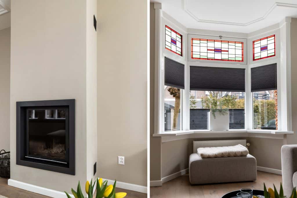 Door de woning heen: je komt binnen via de hal, waar zich de trapopgang naar boven bevindt, de toegang tot de provisiekelder en een modern toilet met fonteintje. Vanuit hier loop je door naar de woonkamer aan de voorzijde van de woning. Wat hier meteen opvalt is de oppervlakte en sfeer. De mooie houten vloer, glas-in-loodramen, gestuukte plafonds en wanden, de erker en de sfeervolle houtgestookte HR-haard zorgen voor een fijne, authentieke uitstraling.