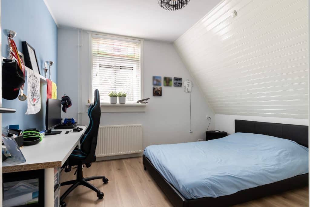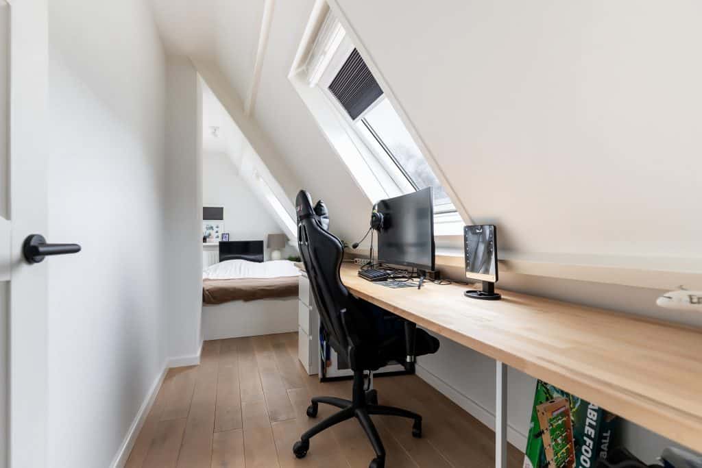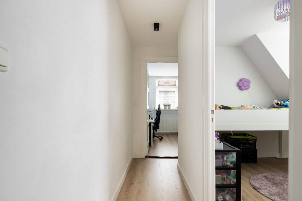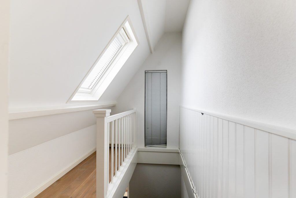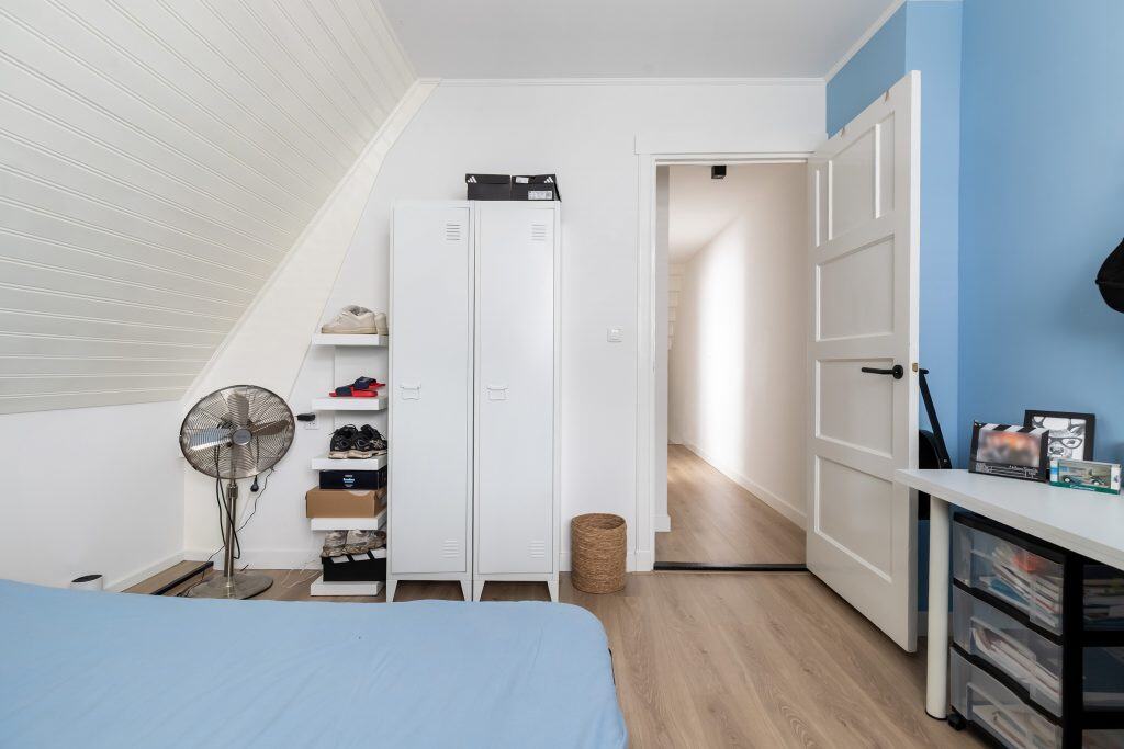 Via een vaste trap lopen we door naar de zolderverdieping. Hier vinden we een verrassend ruime vierde kamer en een handige bergruimte.
