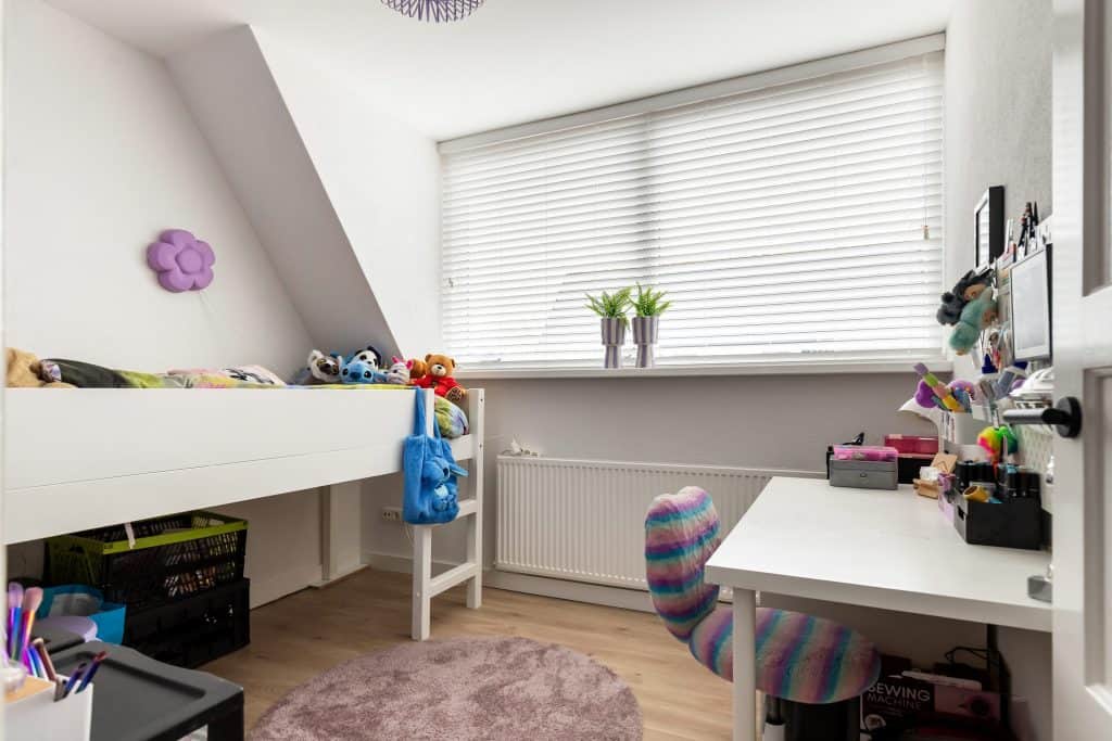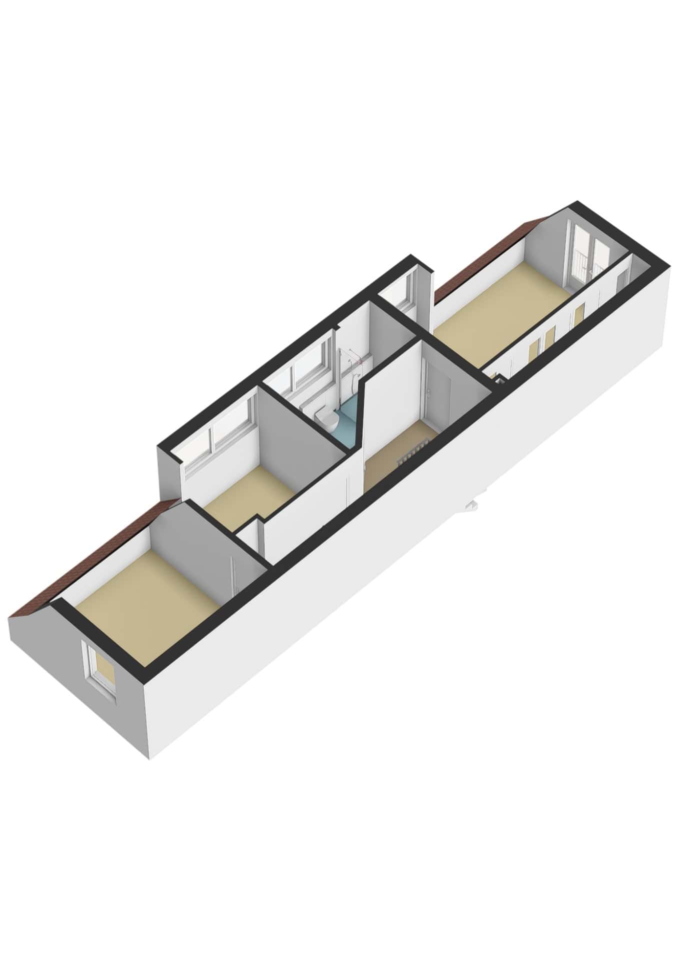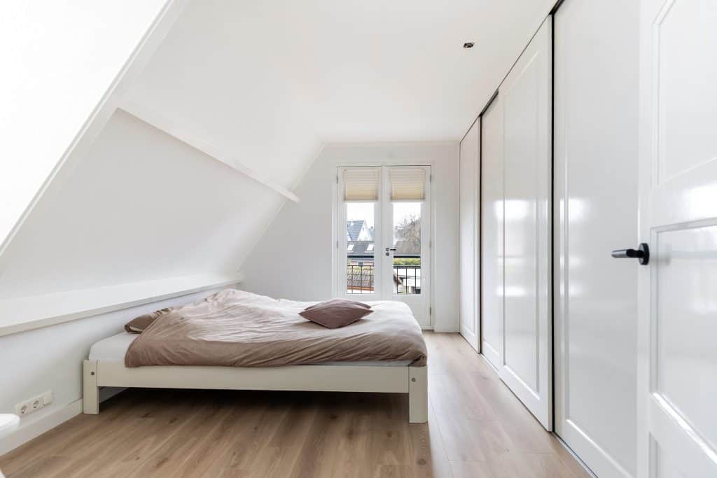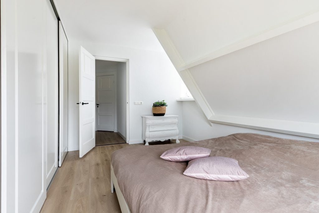 Via een vaste trap lopen we door naar de zolderverdieping. Hier vinden we een verrassend ruime vierde kamer en een handige bergruimte.