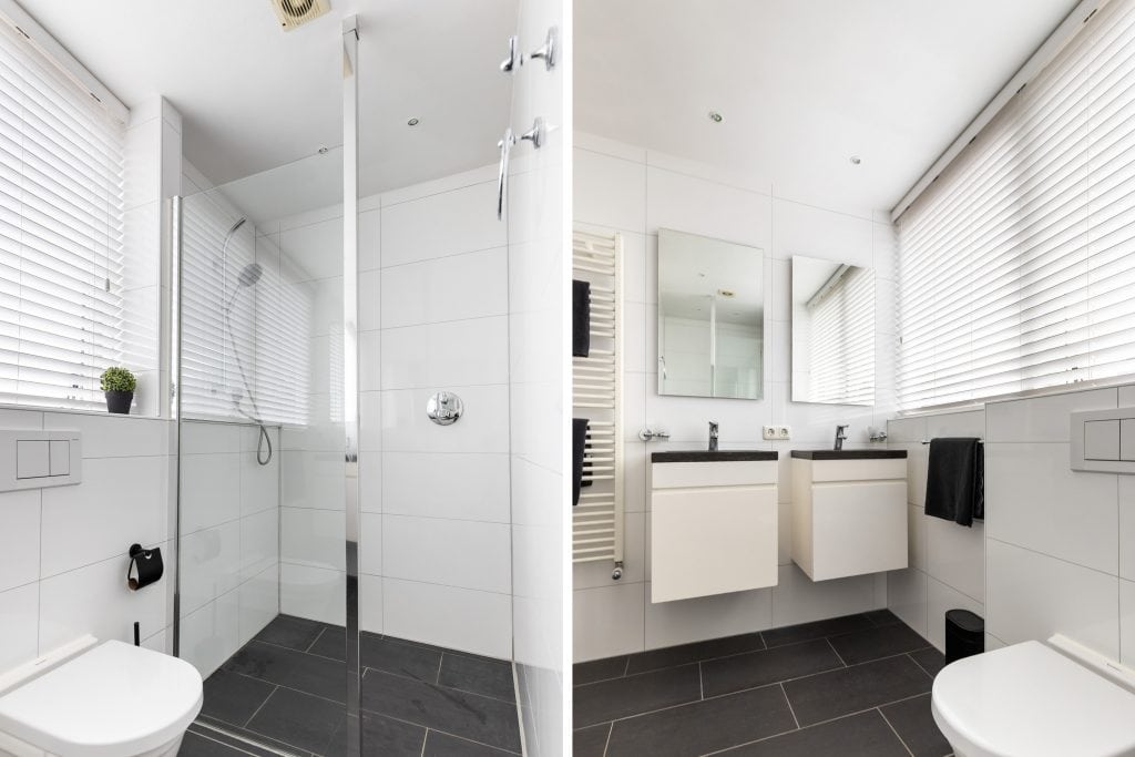 We nemen vervolgens de trap in de hal naar boven. Ook hier ziet het er, net als op de begane grond, top uit. De overloop biedt toegang tot de badkamer en drie slaapkamers. Alle drie de kamers zijn van een prima formaat en twee zijn voorzien van een dakkapel. De tuingerichte ouderslaapkamer is meer dan royaal, heeft dubbele deuren naar een Frans balkon en een grote vaste kastenwand. De moderne, geheel betegelde badkamer is voorzien van twee wastafelmeubels, een tweede vrijhangend wandcloset en een ruime inloopdouche.
