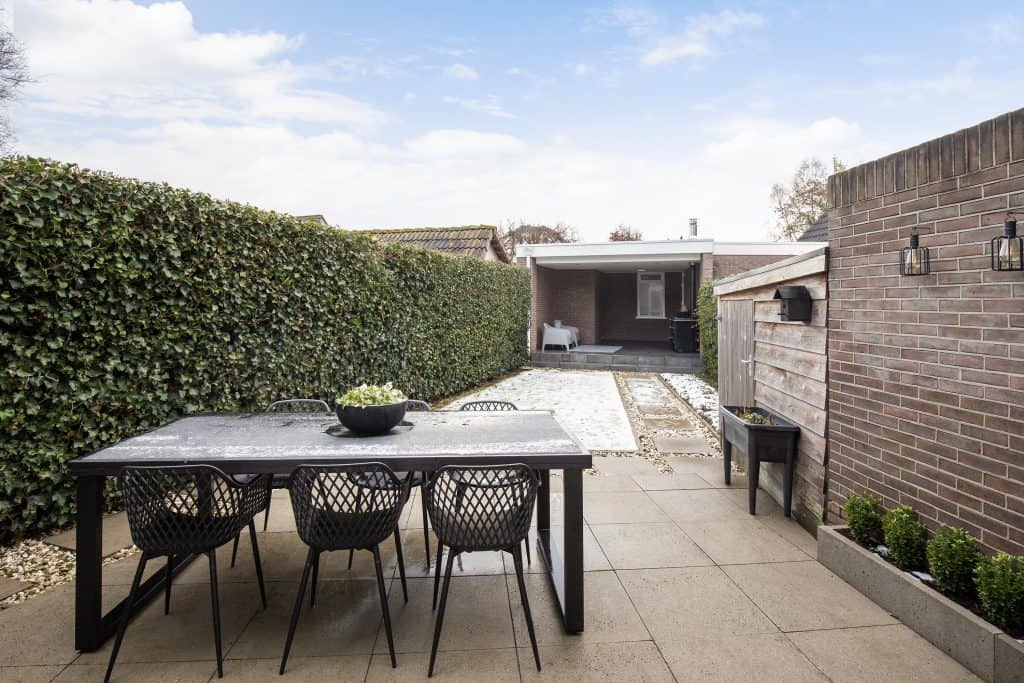 Ook buiten is het hier genieten. Want niet alleen de woning, ook de tuin is keurig verzorgd en fraai aangelegd. De voortuin is netjes aangelegd met bestrating en vaste beplanting en biedt parkeergelegenheid op eigen terrein. De ligging van de achtertuin is op de zonzijde. Je vindt hier veel privacy, sierbestrating, een gazon en achter in de tuin een groot en mooi overdekt terras. Hier kun je ook bij wat minder weer heerlijk zitten.